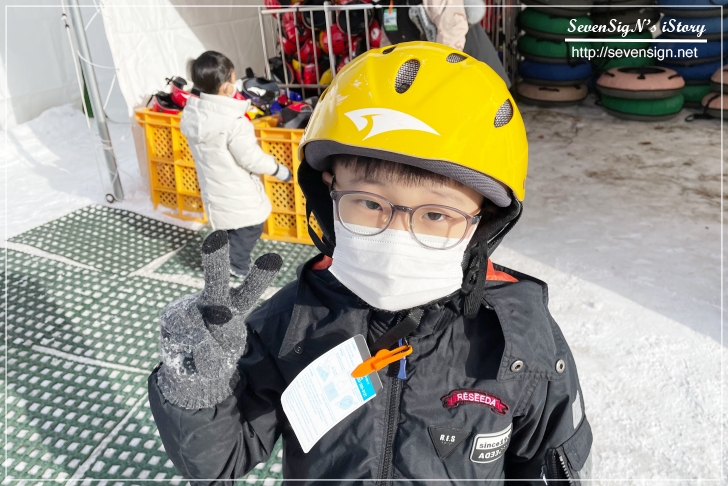 스노우 슬라이드 타기 위해서는 준비된 헬맷을 착용해야 하더라구요.