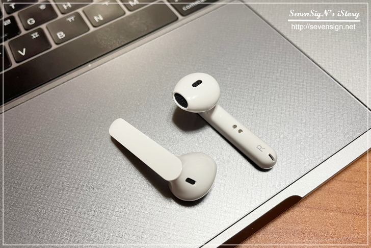 귀에 가볍게 걸치듯이 쏙 ~ 꽂으면 되는 이어폰인데요, 생각보다 안정적으로 착용할 수 있어서 큰 흔들림없이 안정적으로 사용할 수 있더라구요. 스틱에는 충전용 단자와 함께 좌/우 표시가 되어 있는 것을 확인할 수 있습니다.
