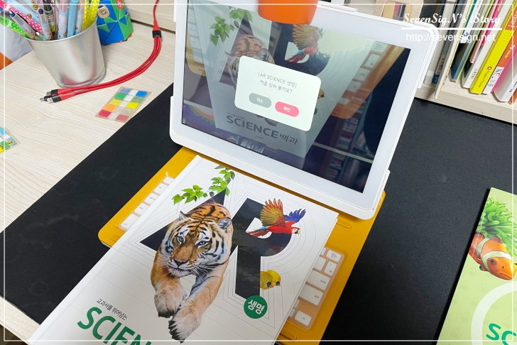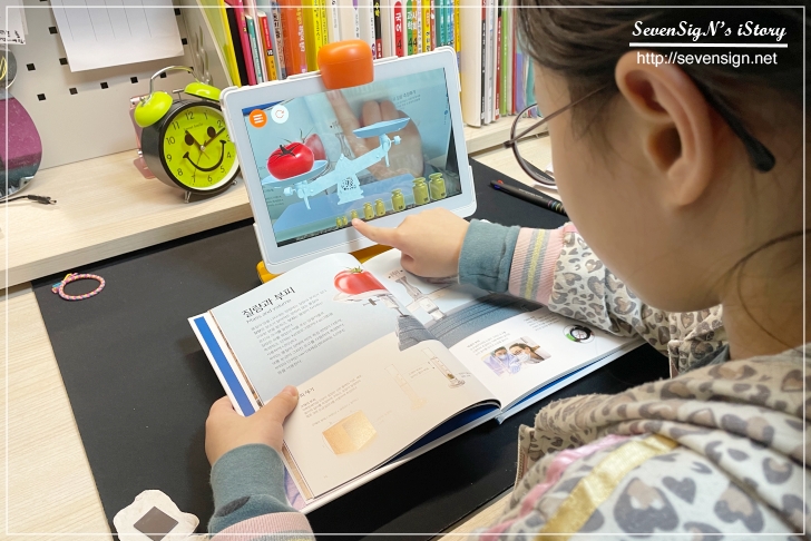 종이책을 바로 가운데 오도록 놓고 AR 사이언스를 시작하면 책을 인식하고 인터랙티브한 과학 공부를 할 수 있습니다.