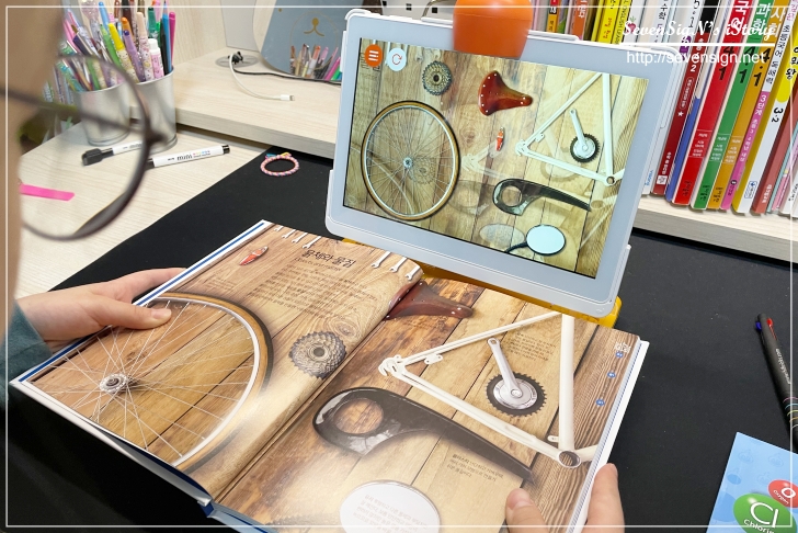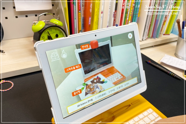 태블릿과 거치대, 반사경, 그리고 전용 AR용 종이책과 마커북 등입니다.