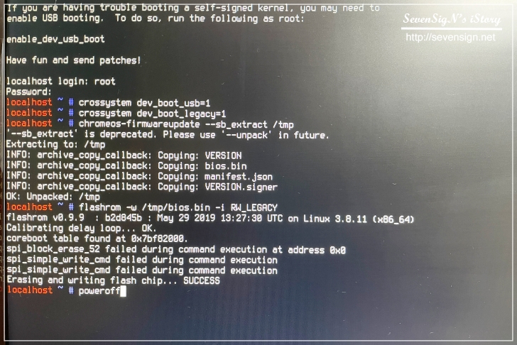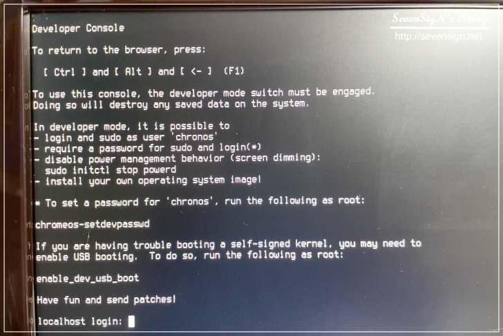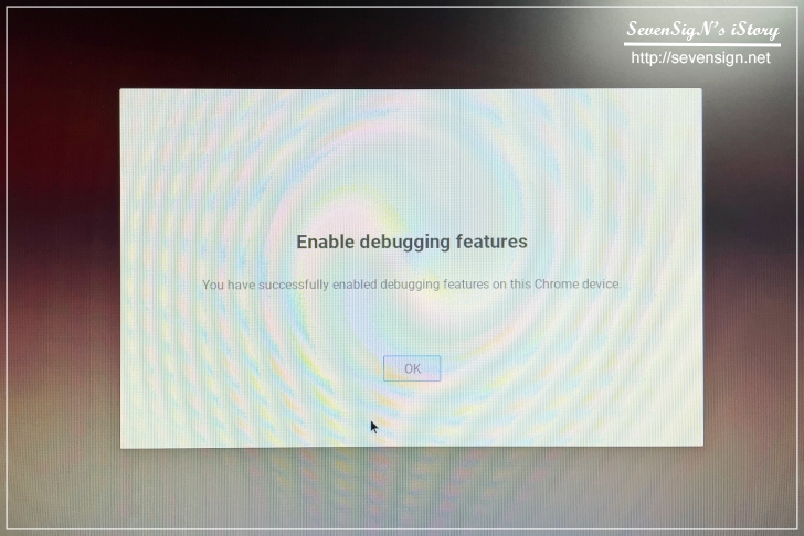 그리고 크롬OS 개발자 콘솔화면에서 사용할 루트계정의 비밀번호를 입력합니다. 새로 등록하는거니 원하는 걸로 입력하면 되는데요, 만약에 여기서 실수로 키보드를 눌러 아무것도 입력안하고 넘어갔다면 비밀번호는 . 로 세팅이 됩니다. 점한개요.