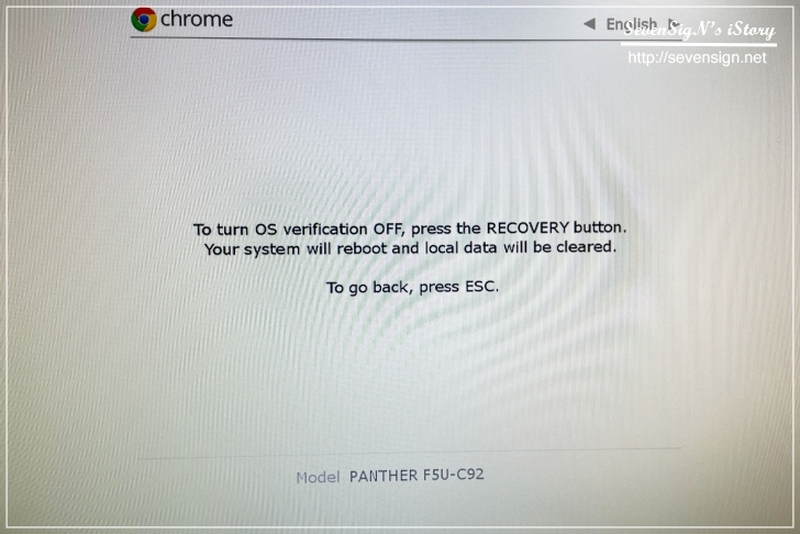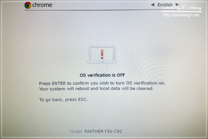 이런 화면을 만나게 되는데요, 이 상태에서 Ctrl + D를 누른 후에 메시지가 바뀌면 리셋버튼만 한번 눌러줍니다. (만약 이미 개발자 모드 진입 과정이 진행중인 상태면 느낌표 화면에서 Ctrl + D가 눌러지지 않습니다. 아래 엔터를 누르는 화면 진행 후 다시 시작하시는게 속편해요)