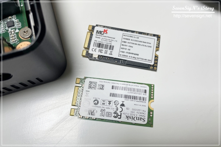 옛날 모델이라 SSD의 인터페이스는 SATA 방식입니다. 요즘 기기에 많이 사용하는 NVMe 인터페이스가 아닌 SATA 방식으로 장착을 해야하고, 사이즈도 제일 짧은 2242 규격의 SSD를 선택하면 됩니다. 조립은 분해의 역순... SSD를 가볍게 꽂아주고, 나사로 고정하고, 무선랜카드를 장착하면 됩니다. 검은색 케이블 연결도 잊지 말아주세요. 그리고 나서 다시 박스를 조립합니다.