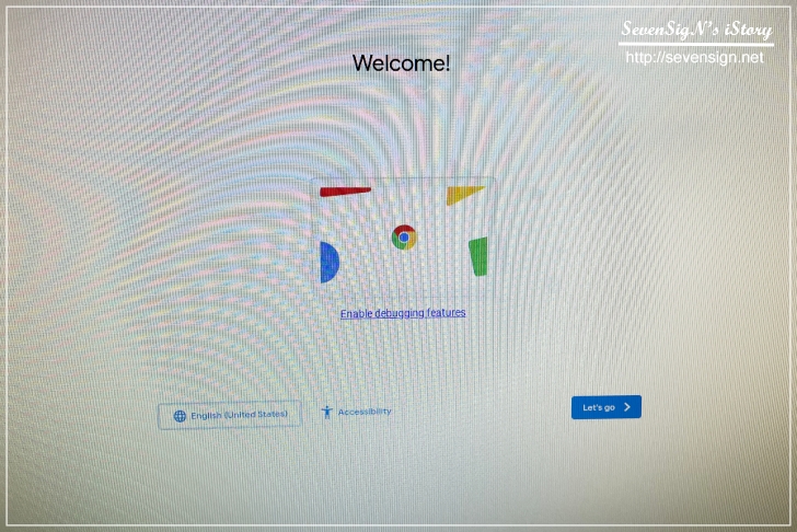크롬박스를 개봉한지 몇일만에 드디어 오늘 전원에 연결해봤습니다. 110v라 돼지코를 연결하고 전원을 넣으니 바로 설정창이 나타납니다. 윈도우나 맥등, 다른 OS를 처음 설치할때 나타나는 화면