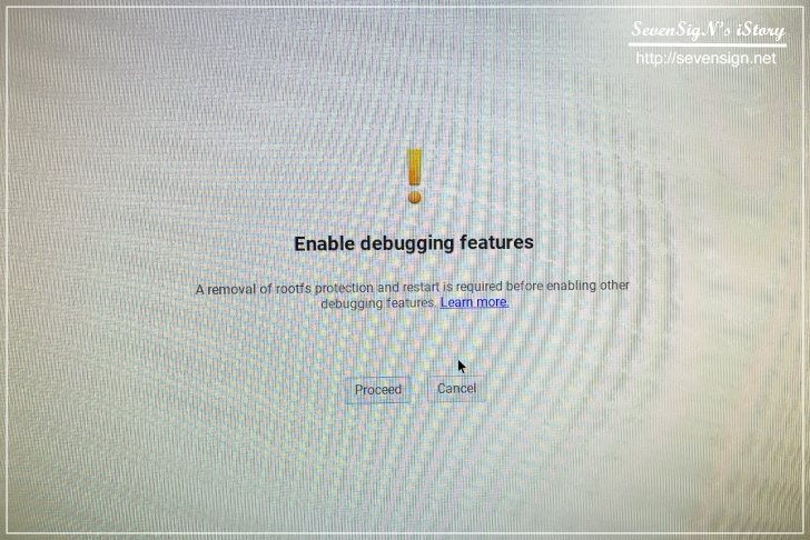 개발자모드에 정상적으로 진입이 되었다면 아래 처럼 Enable Debugging features 를 확인할 수 있습니다. 전 여기까지 오는데 정말 한참 걸렸죠.. Ctrl + D를 누르는 화면에서 키보드가 안눌려져서 엄한 키보드를 바꿔서 해보고 삽질을 했거든요. 그리고 오래 걸려도 끄지 마세요. 그냥 기다리세요.
