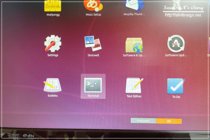 무선인터넷에 연결 후에 화면 가장 왼쪽 아래에 있는 아이콘을 누르면 설치 프로그램들을 확인할 수 있는데, 여기서 화면을 넘겨 터미널을 실행합니다.
