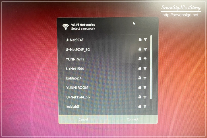 우분투는 배포판에 따라서 이 바탕화면도 다른 것 같더라구요. 이렇게 정상적으로 화면을 만나게 되면 오른쪽 위쪽에 아이콘을 눌러서 와이파이를 연결해줍니다. 스크립트 작업을 하려면 인터넷에 연결이 되어 있어야 하거든요.