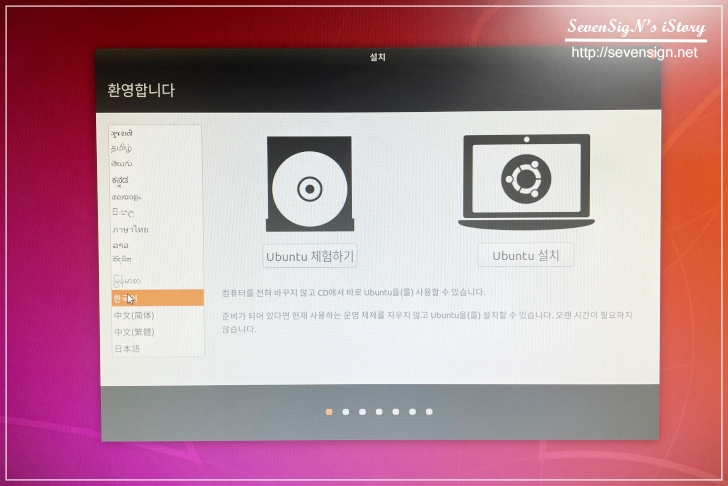 제대로 되었다면 이런 설치화면이 뜹니다. 언어를 선택하고 우분투 체험하기를 선택합니다. 앞으로 윈도우를 쓰지 우분투를 쓸건 아니니까요. 우분투를 체험하는 이유는 부팅환경을 만들어주기 위함이죠.