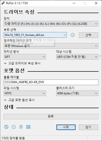- 윈도우10 이미지를 선택하면 파티션 방식이 자동으로 GPT, 대상시스템은 UEFT로 선택이 되더라구요. 파일시스템은 NTFS로 두고 시작을 눌러 만듭니다.