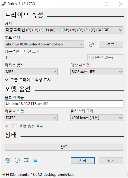 - Rufus 를 다운로드 받고 실행합니다. (윈도우에서만 실행가능) 그리고 우분투 이미지를 선택하고, 파티션방식은 MBR로 대상시스템은 BIOS 또는 UEFI로 선택을 하고 시작을 눌러서 우분투 디스크를 만들어줍니다.