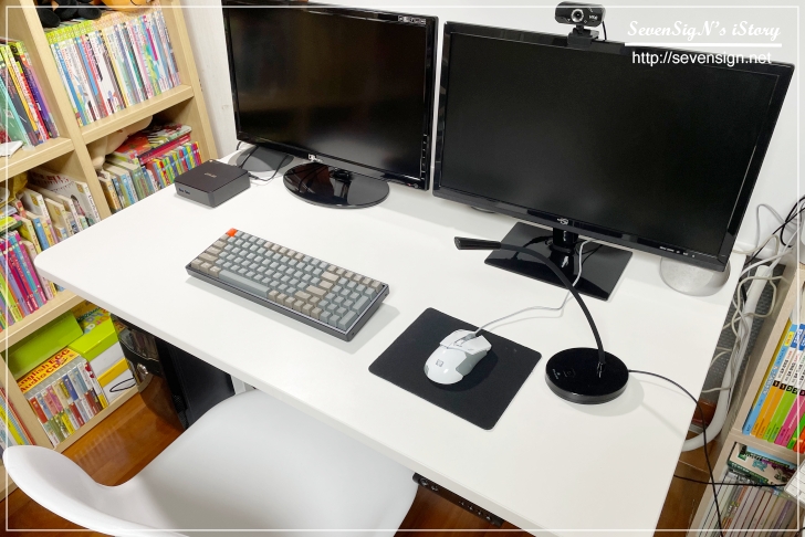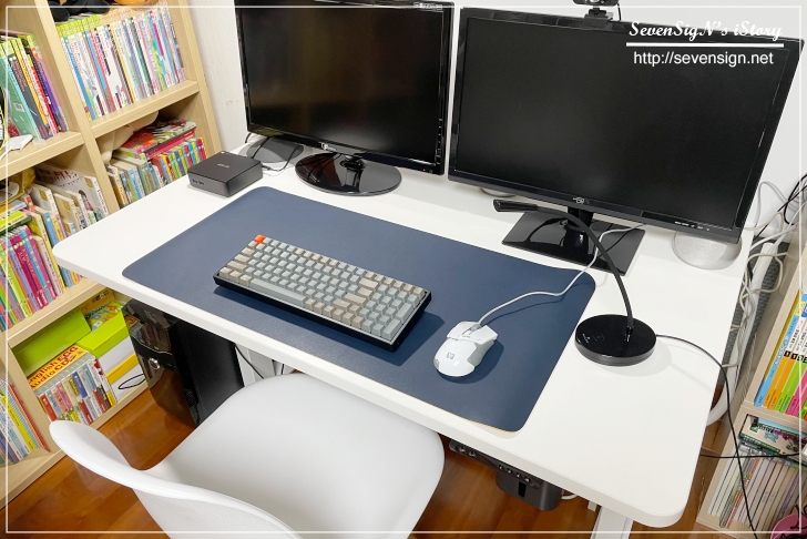 아래가 거실에 있는 컴퓨터 책상입니다. 2개의 모니터를 두고서 아이들이 사용할 수 있도록 해둔건, 저도 단순 작업할 땐 사용하거든요. 그런데 달랑 마우스 패드만 있으니 뭔가 좀 썰렁하기도 하고 아이들이 사용할땐 책상이 차가워서 뭘 하나 깔아두는게 좋겠더라구요. 그래서 레더 와이드 데스크매트를 깔아봤습니다.