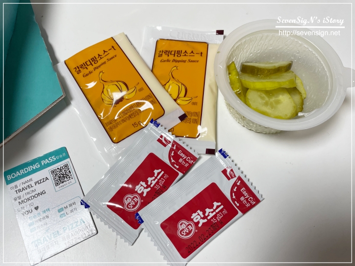 피자를 더 맛있게 먹을 수 있는 갈릭디핑소스랑 피클, 그리고 핫소스가 기본으로 따라오구요.