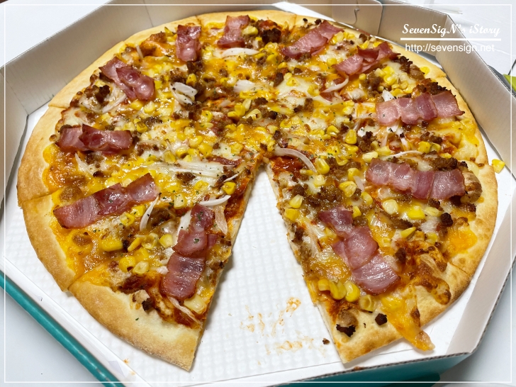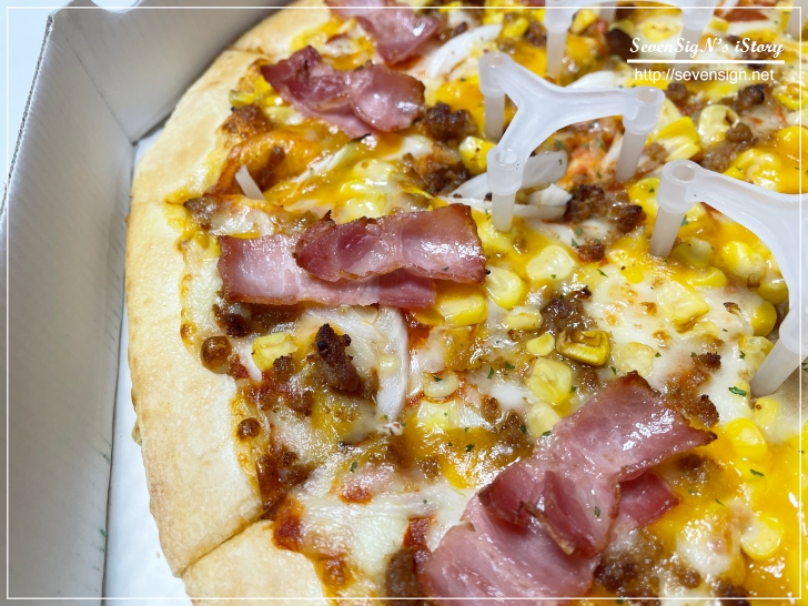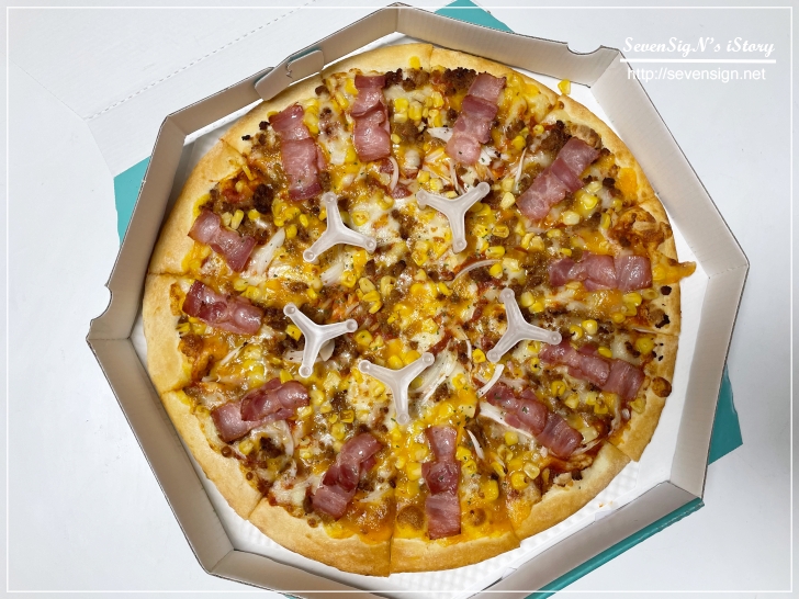 베이컨과 콘, 그리고 치즈가 꼼꼼하게 올려져 있는 옥스포드 베이컨 체다 피자입니다~