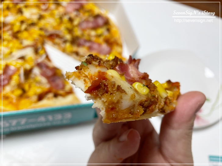 먹기 좋은 크기로 나누어져 있는 피자는 한손에 딱 들어가서 간편하게 먹기 좋네요.