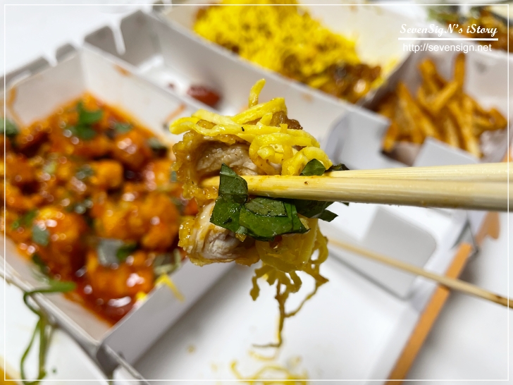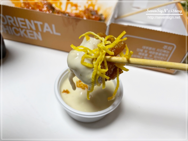 그래서 치킨을 먹는 건지 지단을 먹는건지 모를만큼 크게 집어서 한입 먹어봤습니다~