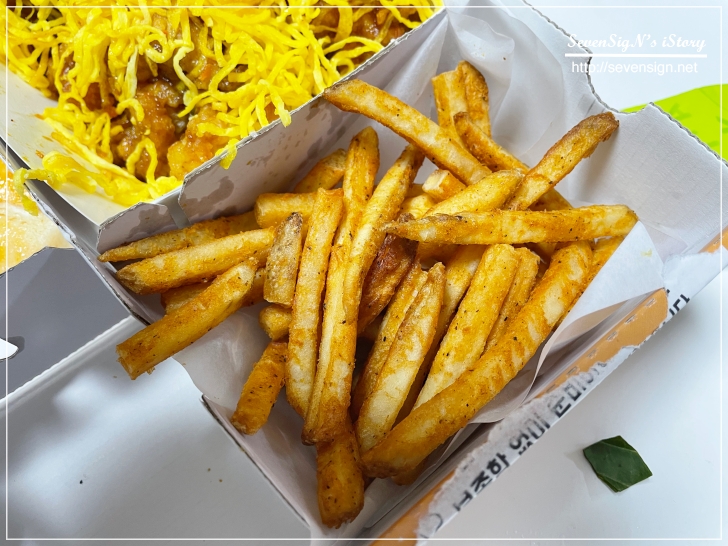 주문한 파닭양념치킨과 황금지단치킨 사이로 떡꼬치도 놓여져 있고, 감자튀김까지 있더라구요.