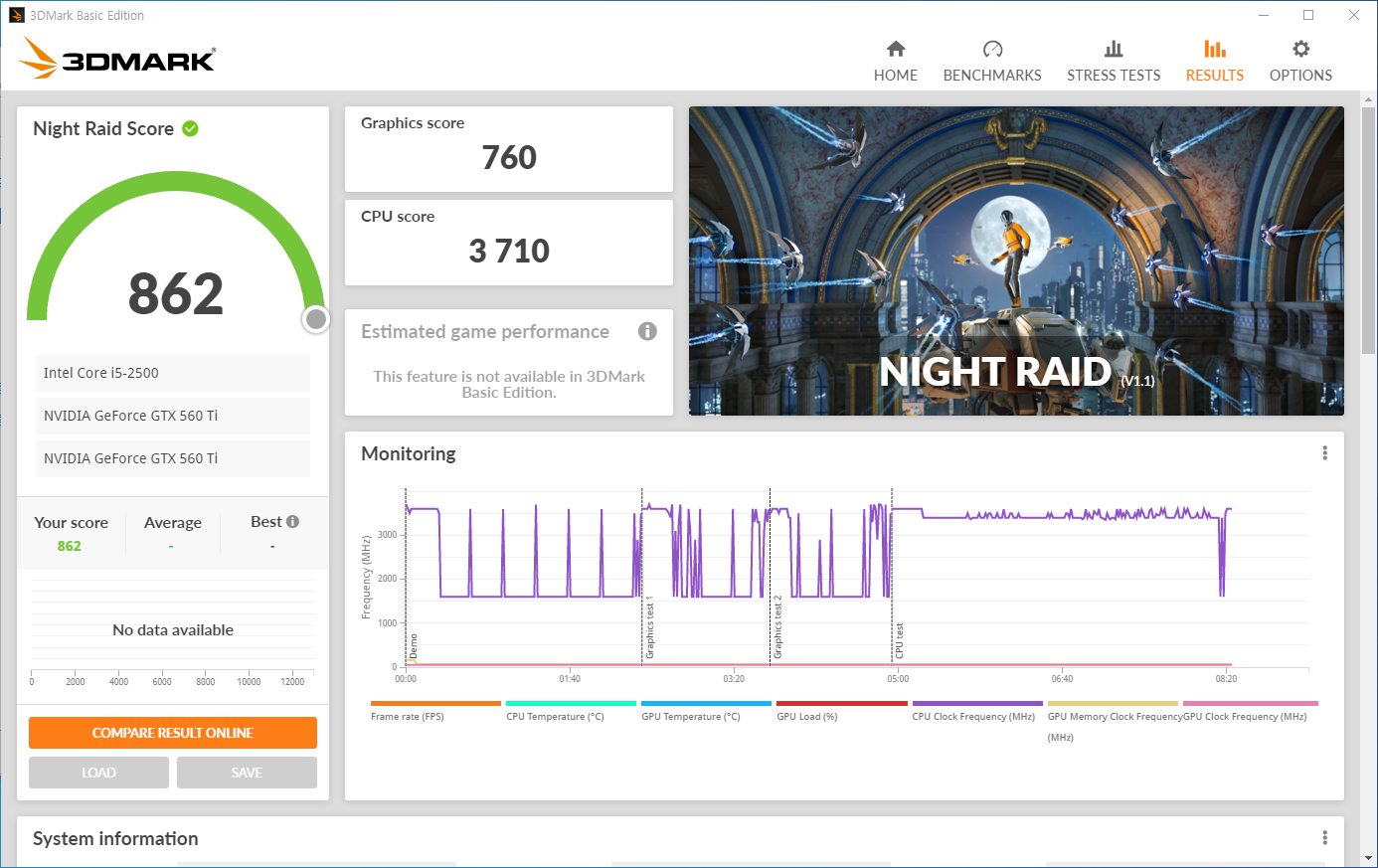 스팀에서 설치한 데모버전이 개별 모드에서는 측정이 됐는데, 이땐 그래픽스코어가 760점이 나왔습니다. 테스트 영상이 달라서 그럴수도 있겠다 싶네요.