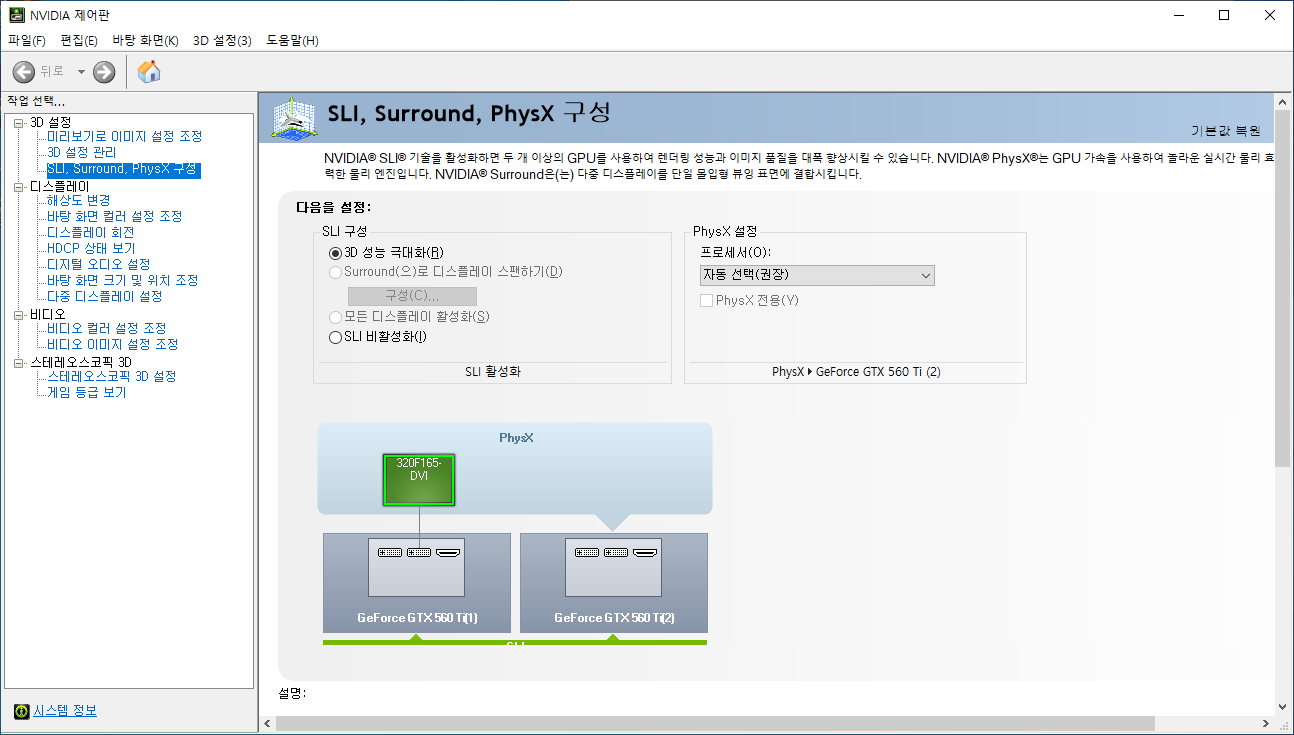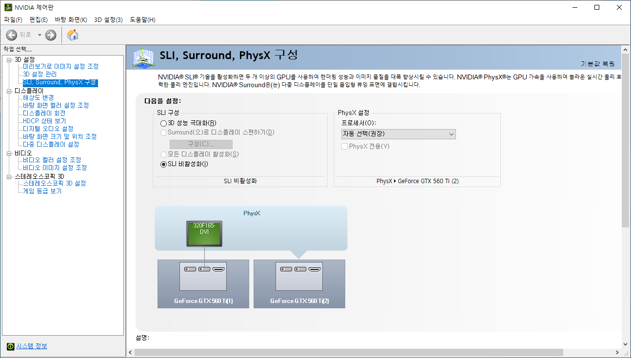 먼저 Sli 를 비활성화한 단독 모드입니다.