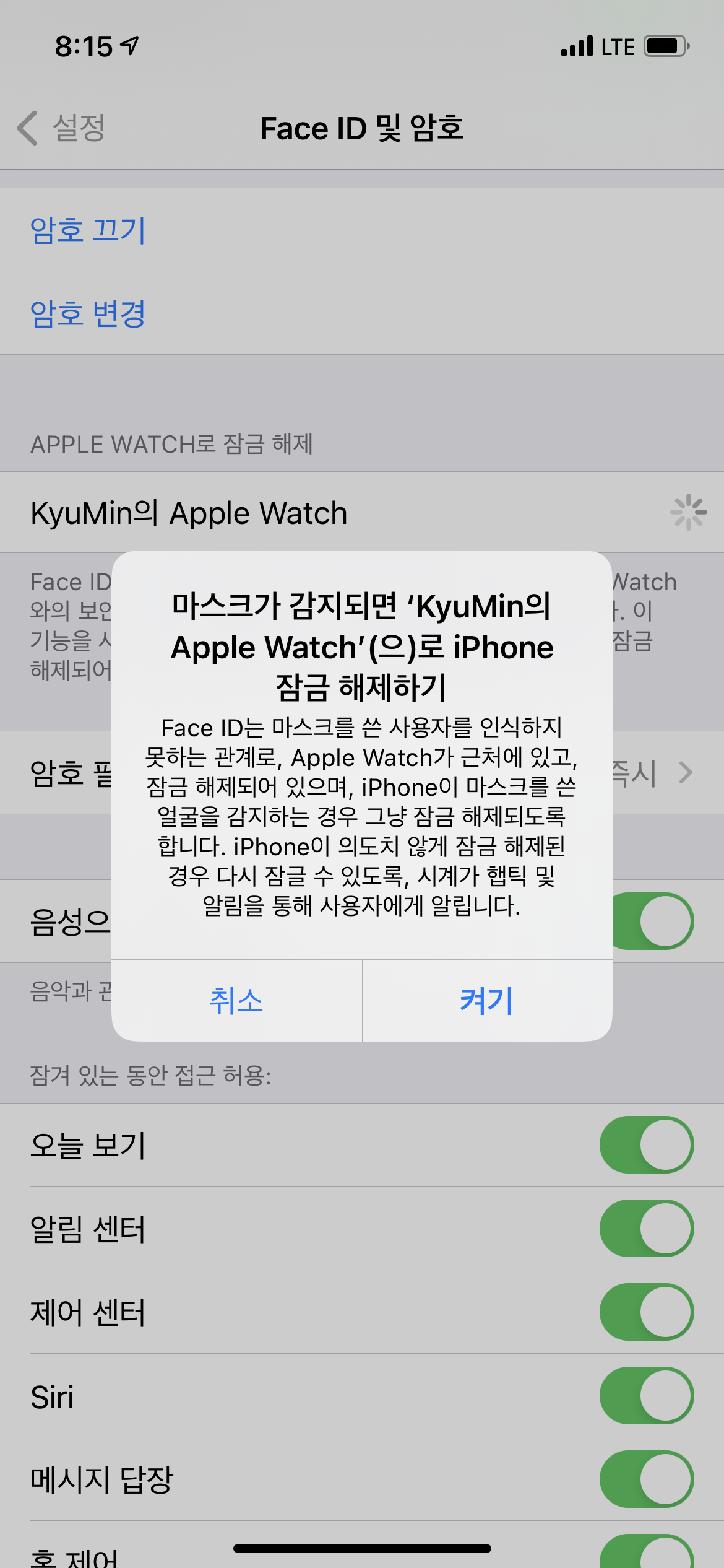 활성화하면 다음과 같은 안내문을 확인할 수 있고, '켜기'를 누릅니다. 그럼 이제 워치를 차고 있을땐 예전처럼 Face ID를 사용할 수 있습니다.