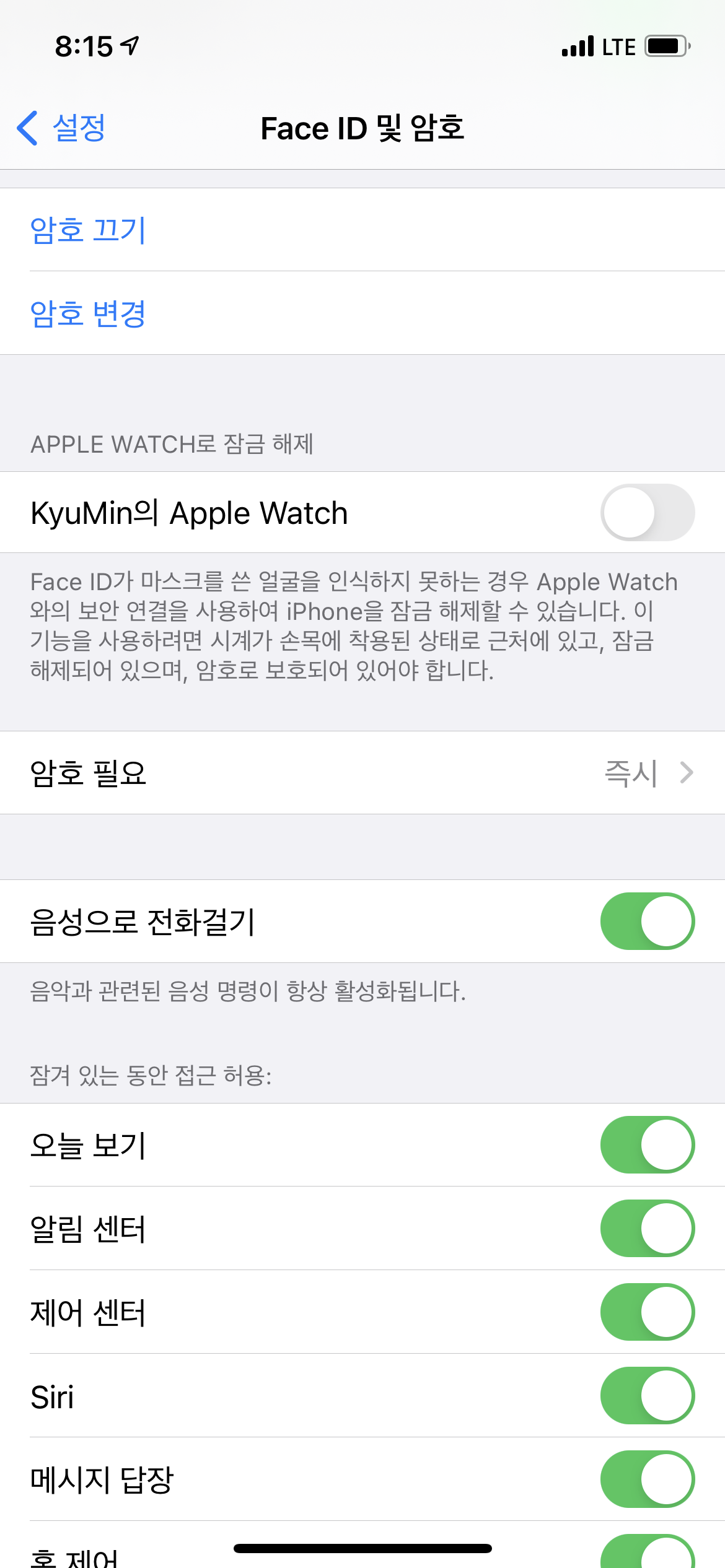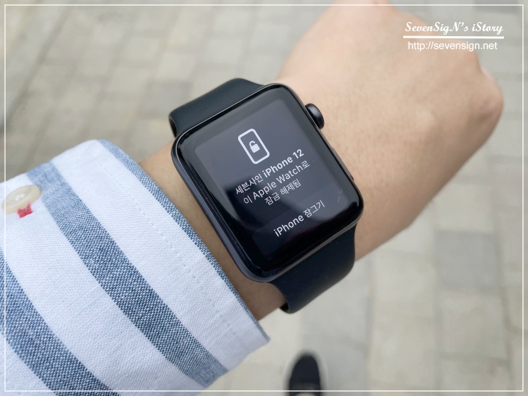 마스크를 사용하면 와치에서 진동이 살짝오면서 이렇게 메시지가 뜨고, 아이폰은 잠금해제가 됩니다. 애플워치도 잠김상태가 아니어야 합니다. 애플워치를 풀었다가 다시 차면 암호가 나오도록 해놓은 분들은 암호를 입력해서 잠금을 해제놔야하죠.