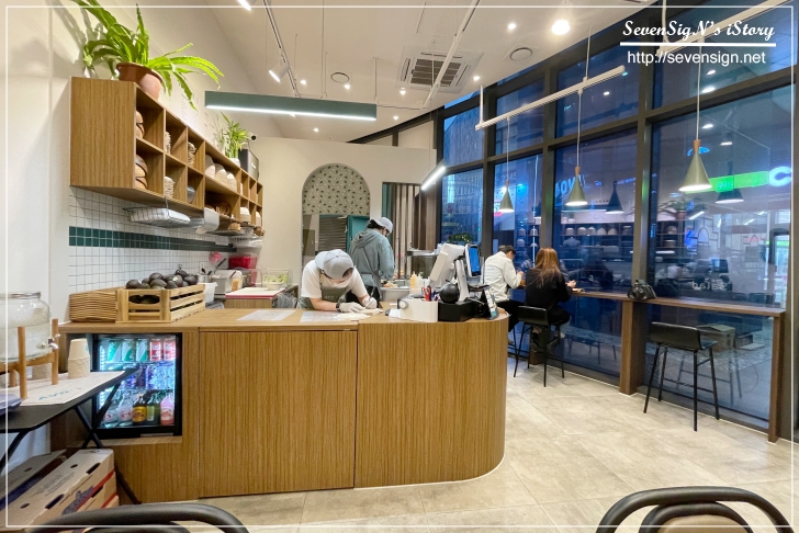 깔끔한 통유리 창, 테이크아웃 윈도우가 있는 깔끔한 컬러의 아보 매장입니다.