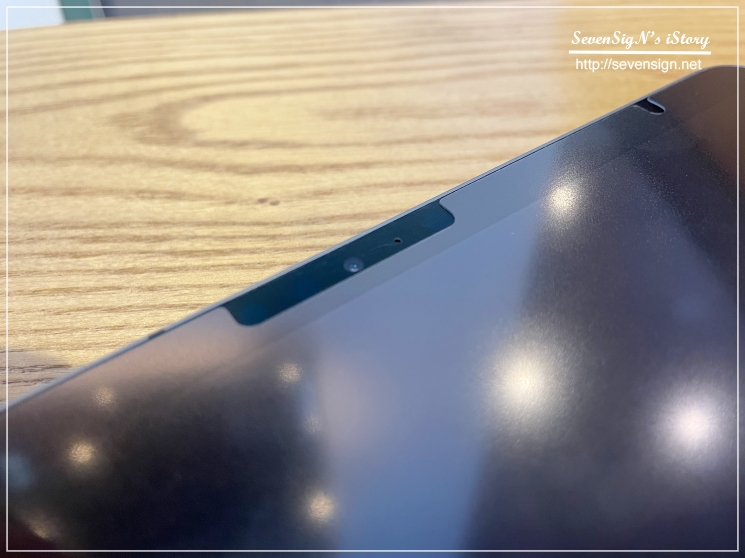 부착전에 아이패드 프로 11에서 위치를 한번 잡아보고 핏을 확인해봅니다. 스피커와 카메라 부분을 중심으로 일단 맞춰보면 부착에 도움이 되죠. 핏이 정확해서 좌우측 여백없이 부착해보면 되겠더라구요.