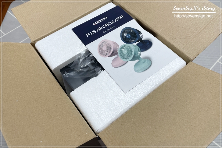 그 아래에 스티로폼 완충제에 안전하게 포장되어 있는 퀸나 플러스 에어 써큘레이터가 있습니다.