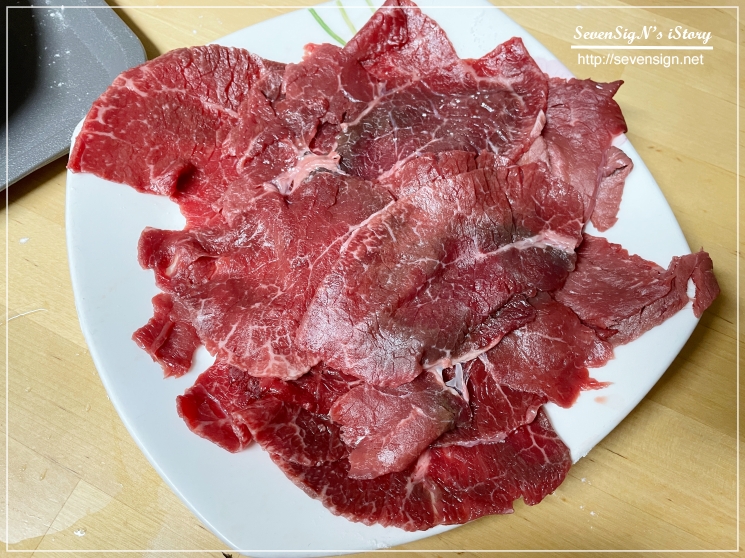 일단 소고기 핏물을 좀 빼주고 얇게 준비되어 있는 소고기를