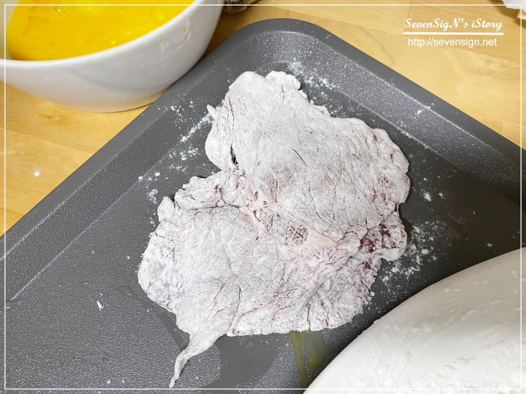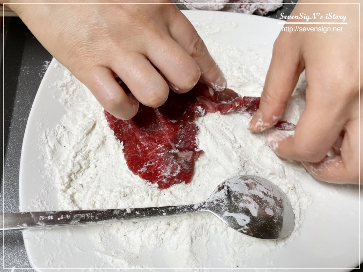 그리고 미리 준비한 튀김가루와 전분가루를 소고기에 묻혀주었습니다.