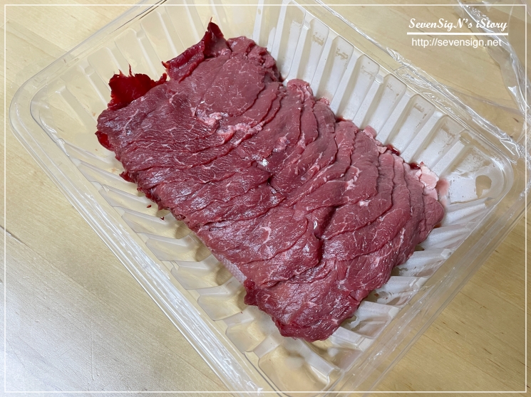 일단 소고기 핏물을 좀 빼주고 얇게 준비되어 있는 소고기를