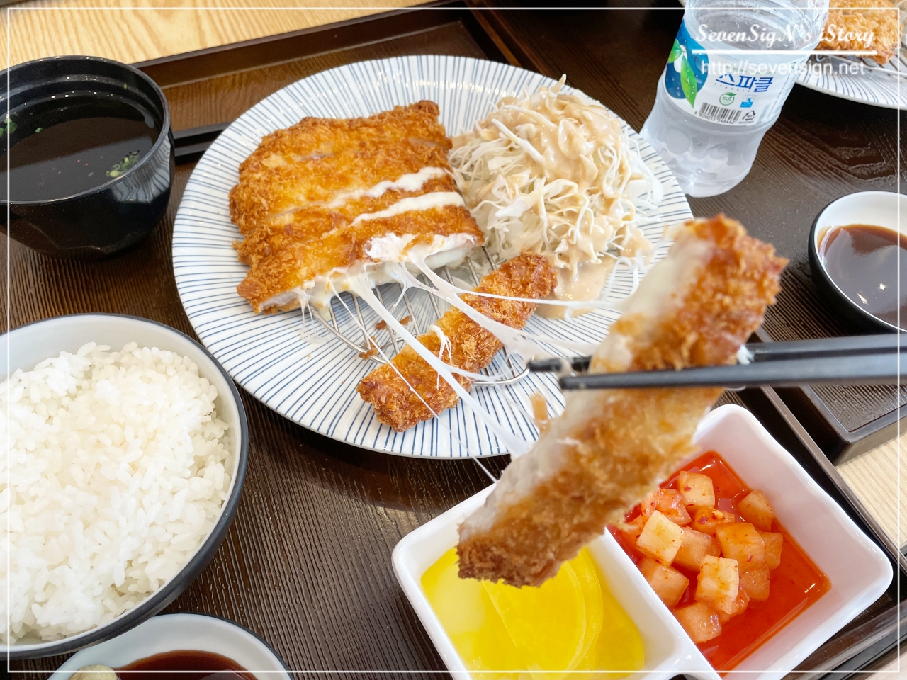 치즈돈까스를 하나 들어서 쭈~~~욱 땡기니 치즈가 쭈~~~욱 늘어나네요.