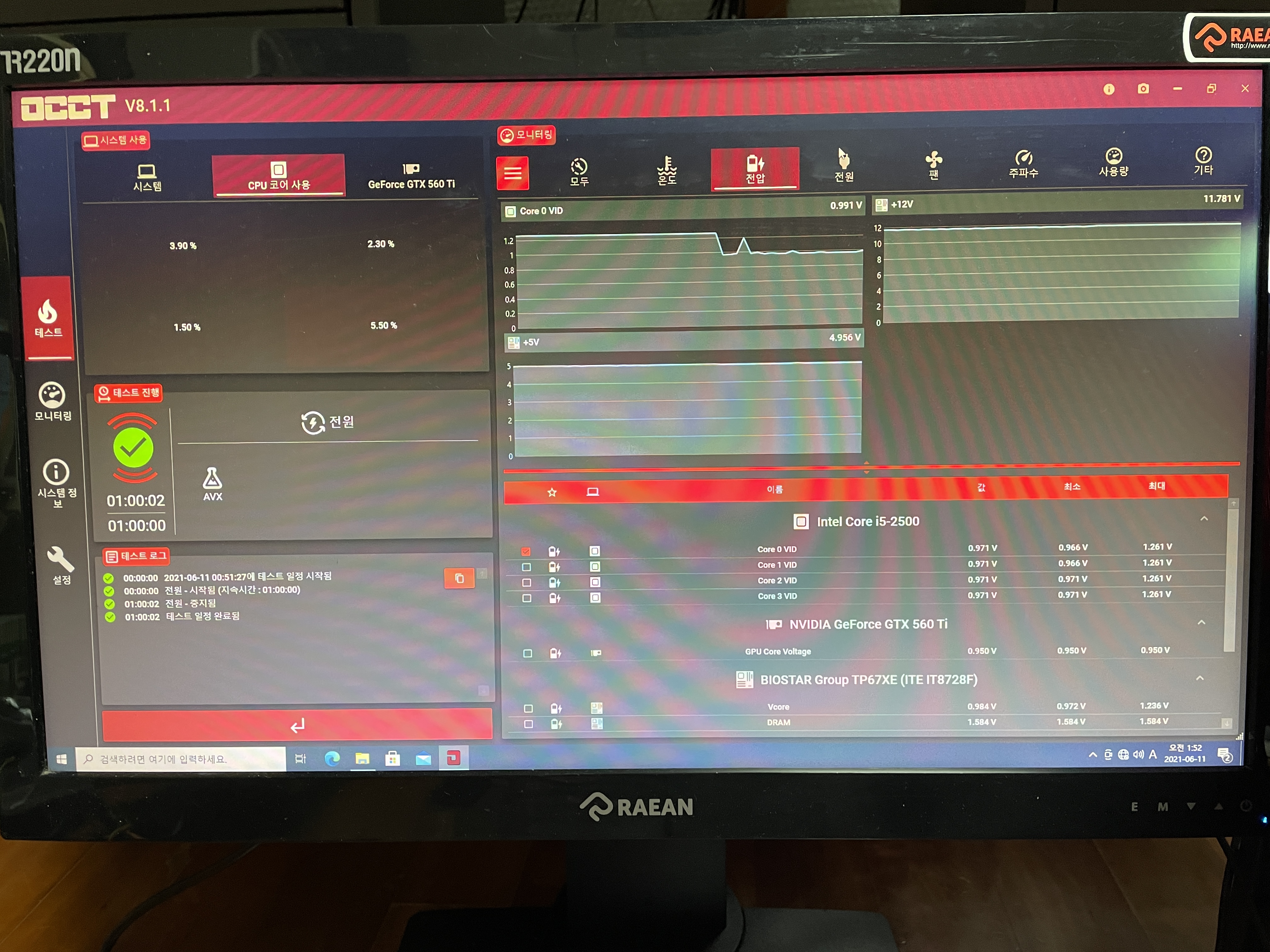 | OCCT를 통한 파워 벤치 테스트 결과입니다. 1시간동안 돌려봤는데요, +12V, +5V 수치가 안정적으로 유지되어서 전력 공급이 원활한 것을 확인할 수 있었습니다.