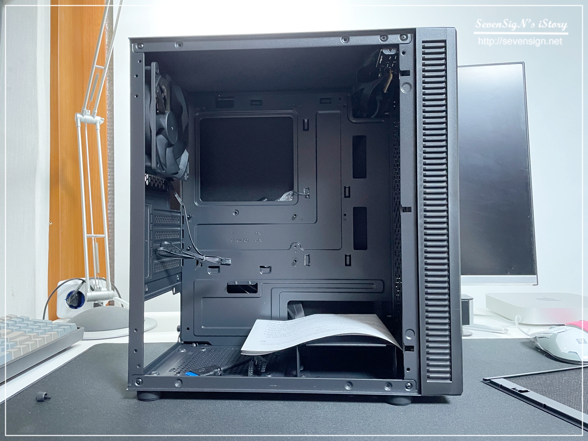 | 측면 덮개를 오픈한 모습인데요, 측면 덮개에도 꽉~차게 방음패드가 부착되어 있어서 저소음 케이스라는 타이틀에 어울리도록 설계되어 있다는 것을 느낄 수 있었습니다.