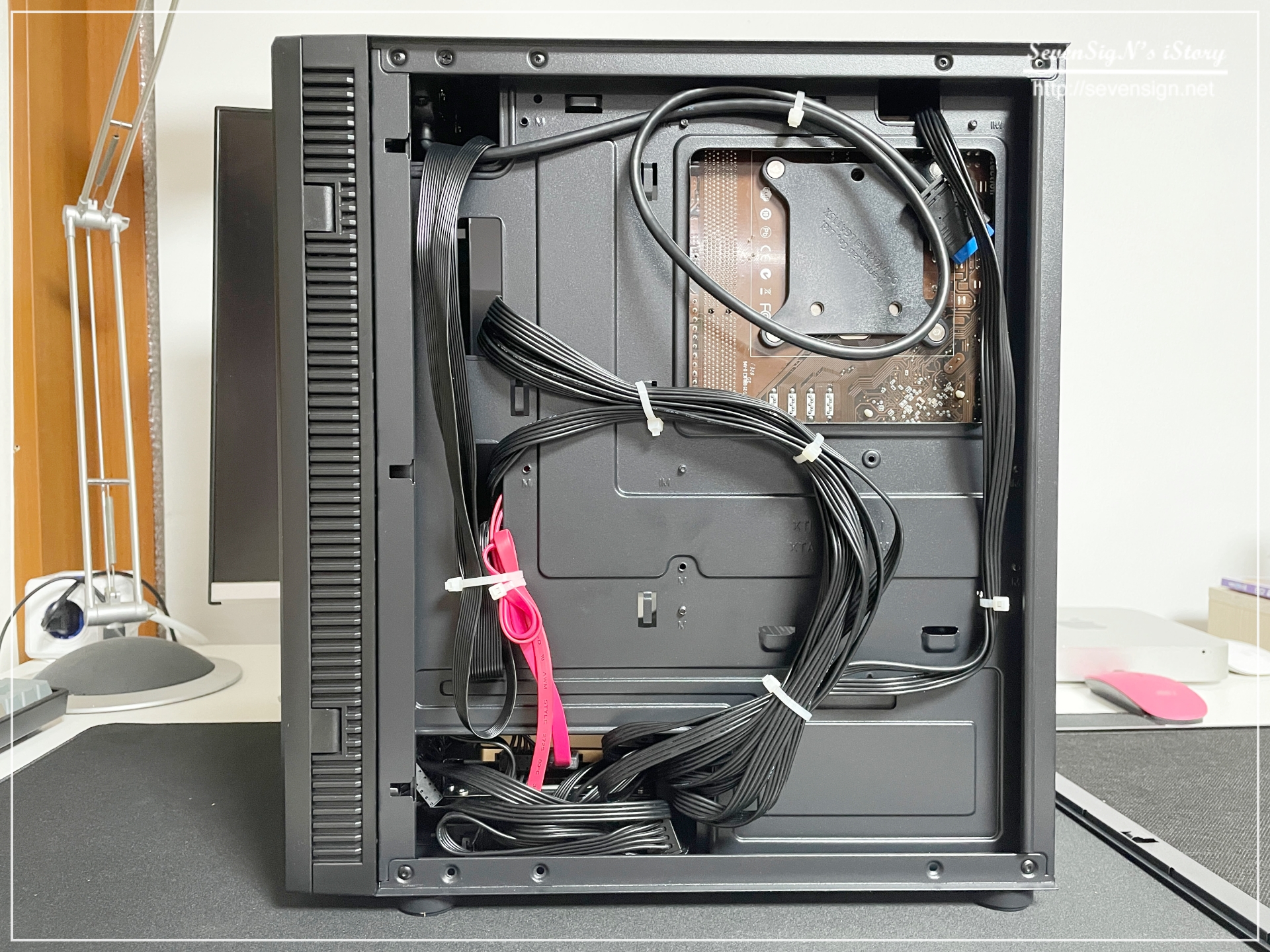 | 앱코 NCORE S10M 사일런티 II 케이스 내부의 홀을 이용해 케이블을 밖으로 빼내어 반대편 공간에서 정리를 해주는거죠.