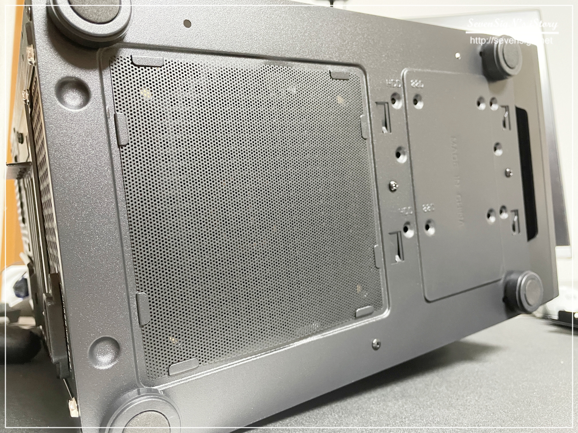 | 앱코 NCORE S10M 사일런티 II 케이스 바닥에는 파워로 유입되는 먼지를 막아주는 망이 있습니다. 그리고 바닥에는 4개의 다리가 있고 다리에는 미끄럼방지 패드가 있어서 케이스를 안정적으로 지지해줍니다.