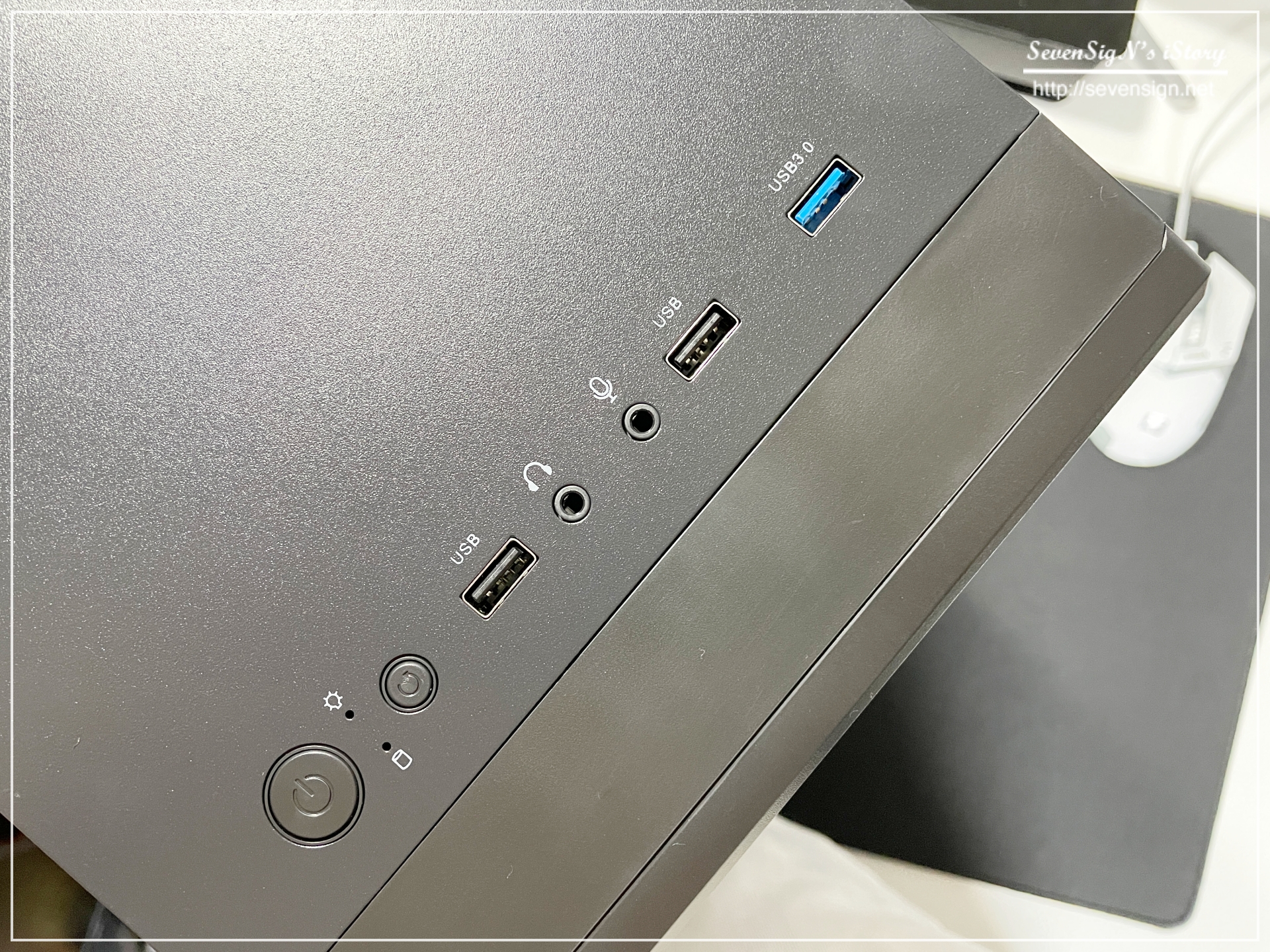 | 요즘 트렌드에 맞게 버튼부 및 각 단자는 상단에 위치해있습니다. 왼쪽부터 전원버튼, 리셋버튼, USB 2.0, 헤드폰 단자, 마이크단자, USB 2.0, USB 3.0 포트로 구성되어 있습니다.