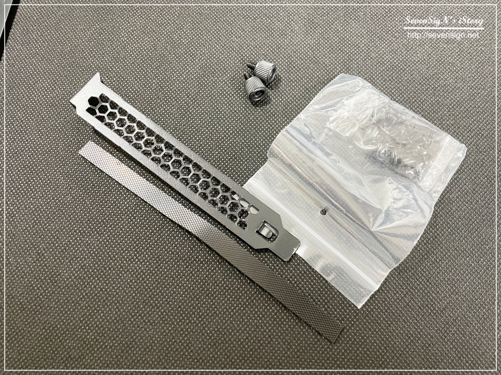 | 기본적으로 포함되어 있는 구성품입니다. 슬롯덮개 1개와 나사 그리고 찍찍이 스타일의 케이블타이가 하나 들어 있네요.