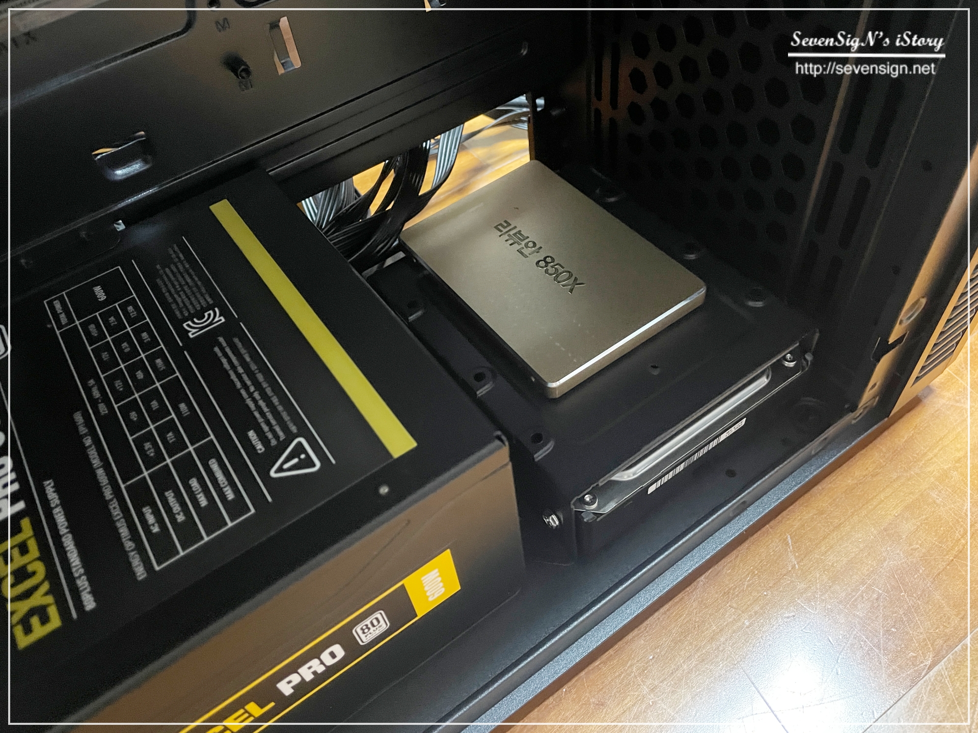 | 케이스를 교체하면서 얼마전에 생긴 파워로 설치하였습니다. 파워도 상태가 왔다리 갔다리 해서..ㅎ 파워 오른쪽에 보이는 것이 SSD와 HDD를 장착하여 고장하는 장치입니다.