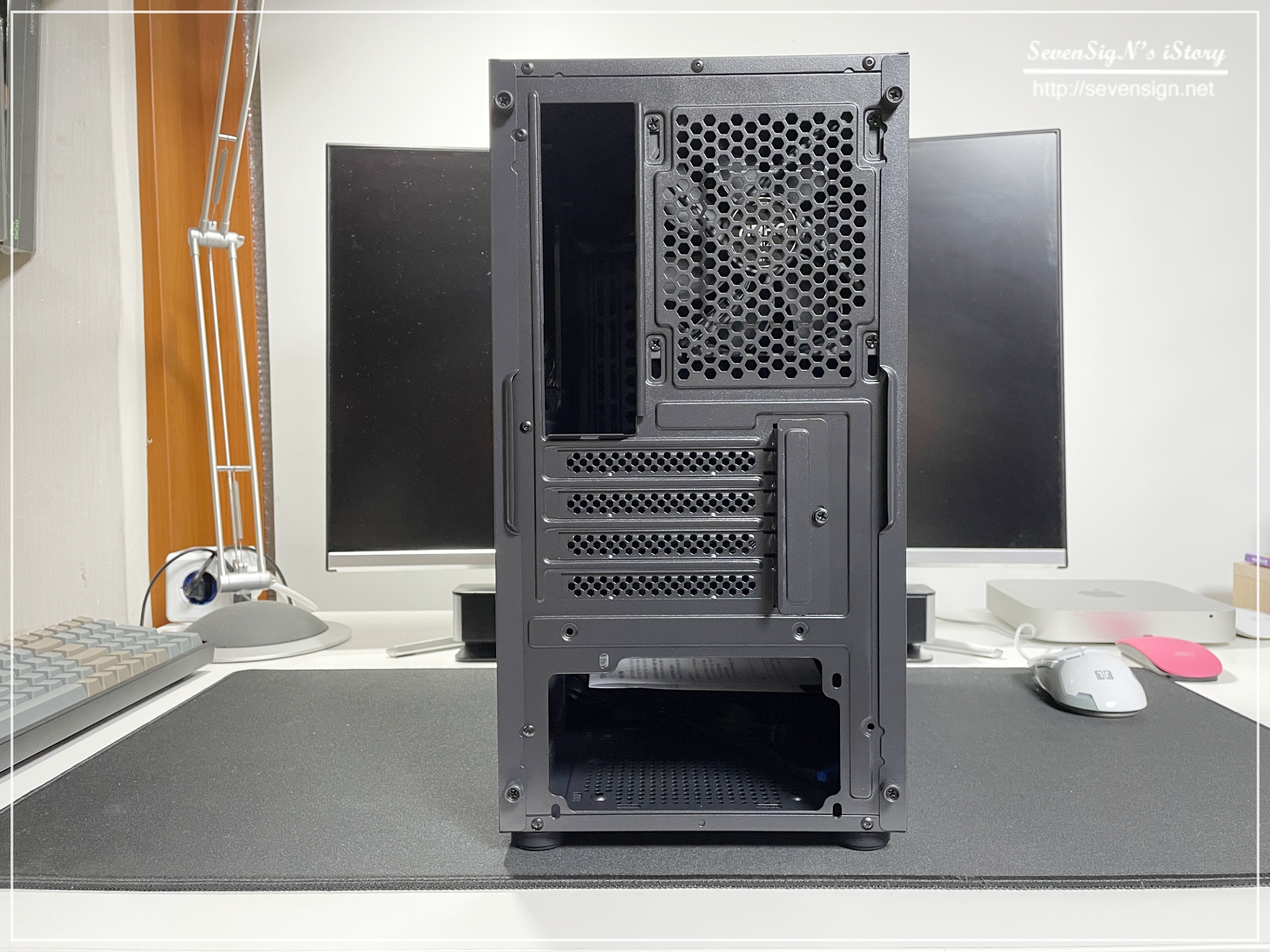 | 뒷면입니다. 메인보드의 백패널 위치와 쿨링팬, 4개의 슬롯, 그리고 파워공간이 보이네요. 파워가 하단에 위치하는 형태란 걸 알 수 있습니다.