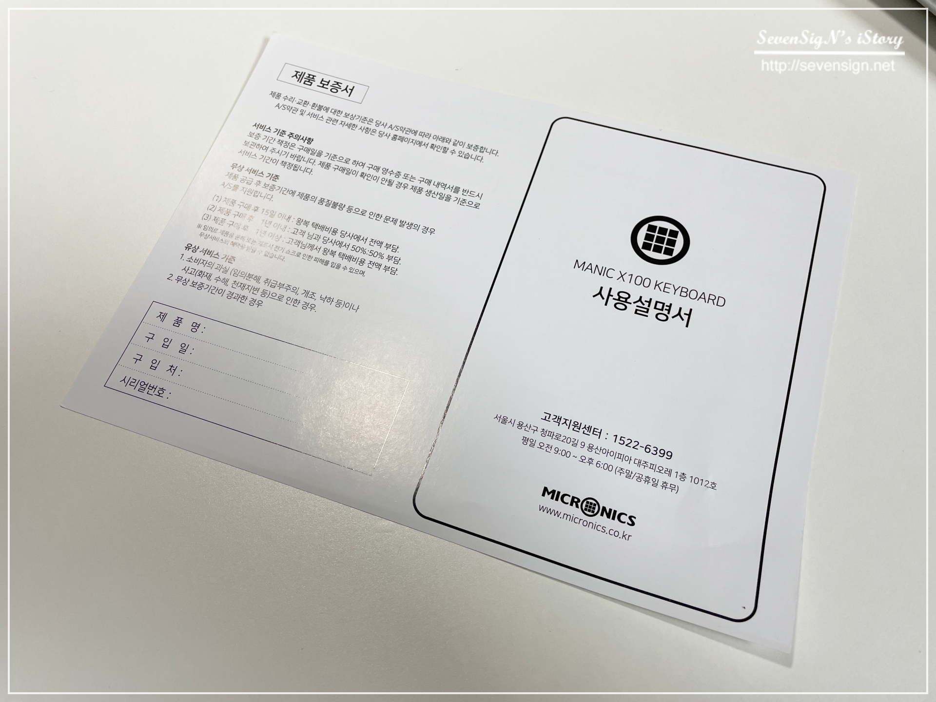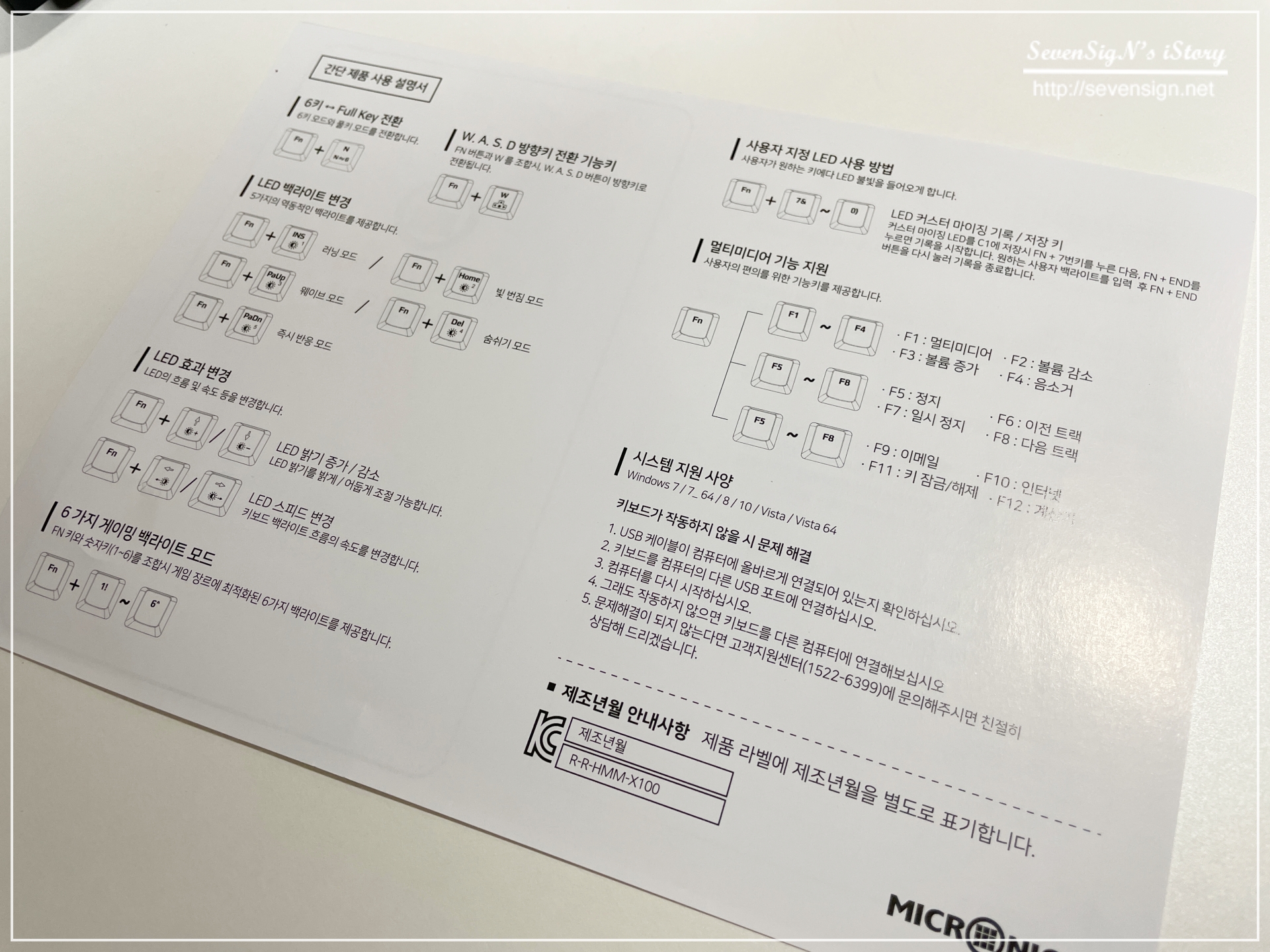 | 사용설명서 겸 보증서가 한장이 있는데, 제품 사용 설명서에 LED 설정에 대한 방법이 나와있기 때문에 새로운 키보드를 구입한다면 기계식 키보드는 섦여서를 안읽어볼 수가 없습니다. ㅎ