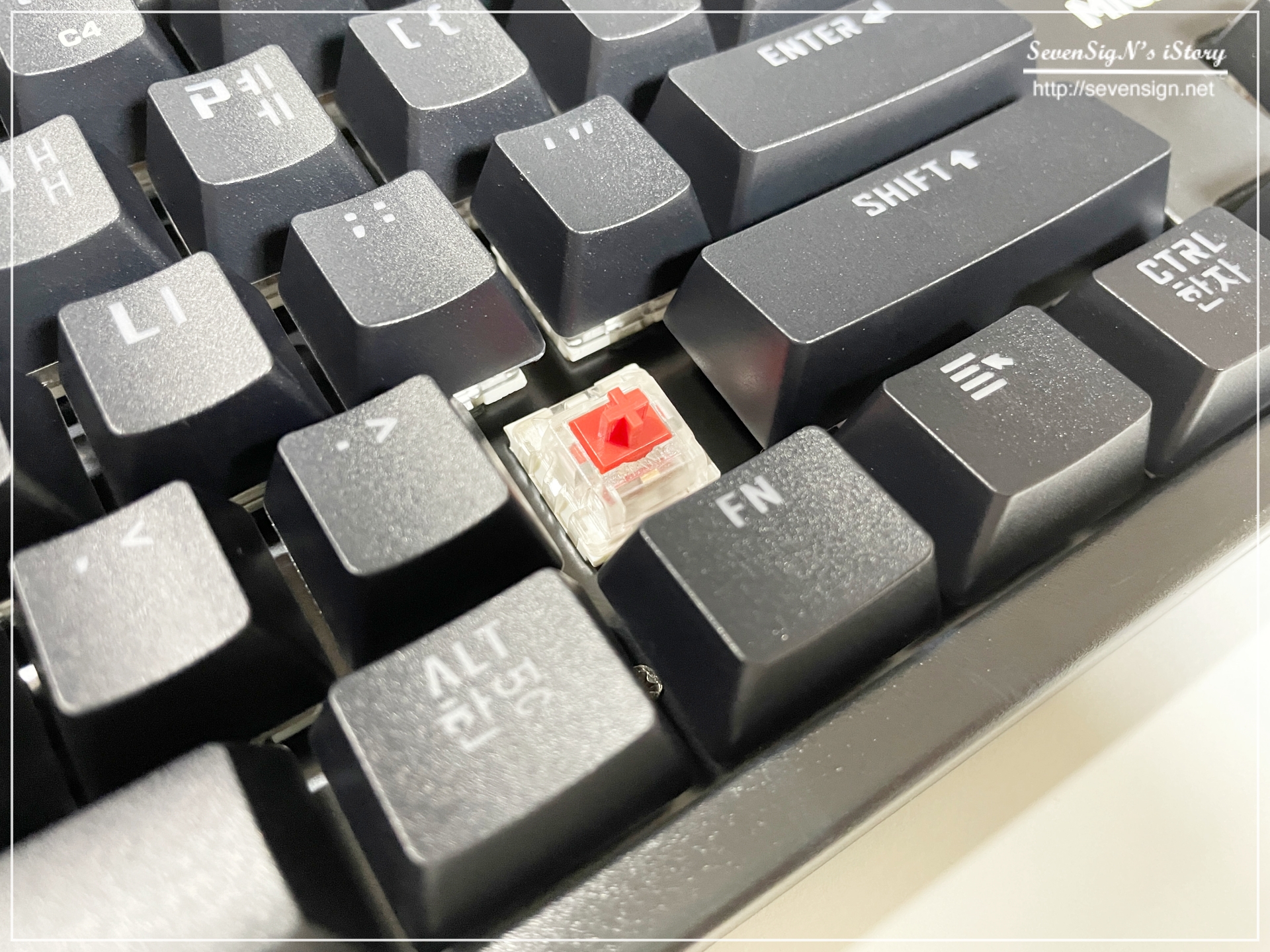 | 키캡을 분리해봤는데요, 스위치가 적축이죠? 청축은 파란색, 갈축은 말그대로 갈색으로 되어 있습니다. 적축은 말씀드린대로 약간 서걱거리는 느낌으로 청축보다 조용한 타건감을 느낄 수 있습니다. 청축이나 갈축은 저마다의 다른 느낌이 있으니 기회가 된다면 직접 체험해보면 좋습니다. 이 스위치가 2세대 MANIC 기계식 스위치인데, 마이크로닉스에서 직접 개발에 참여한 기계식 스위치라고 하네요.