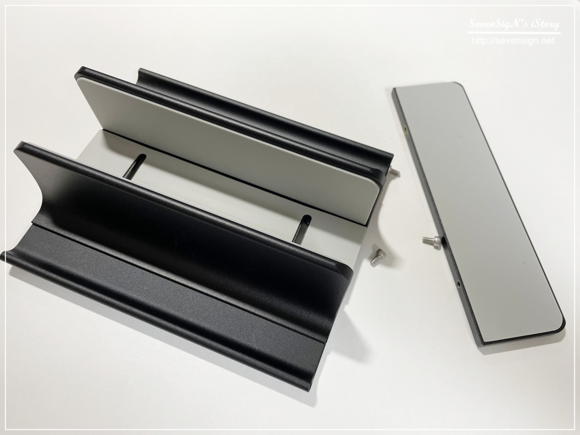 | 디툴즈의 스마트 버티컬 스탠드 본체입니다. 컬러는 실버와 블랙 2가지 색상이 있는데 전 블랙으로 했구요, 원 슬롯과 투 슬롯 중에서 선택할 수 있는데, 맥북과 아이패드를 생각하고 투 슬롯으로 해봤습니다.