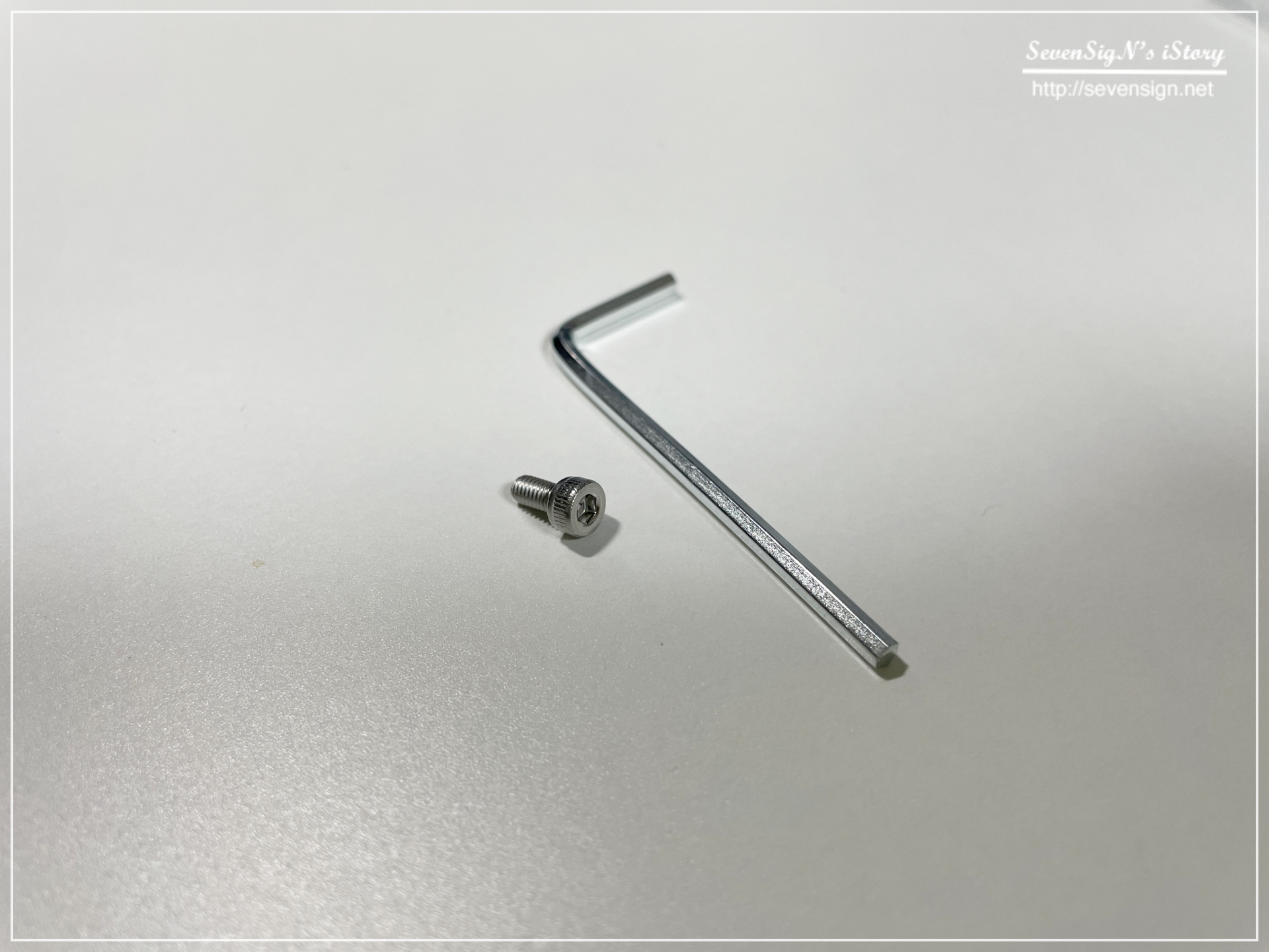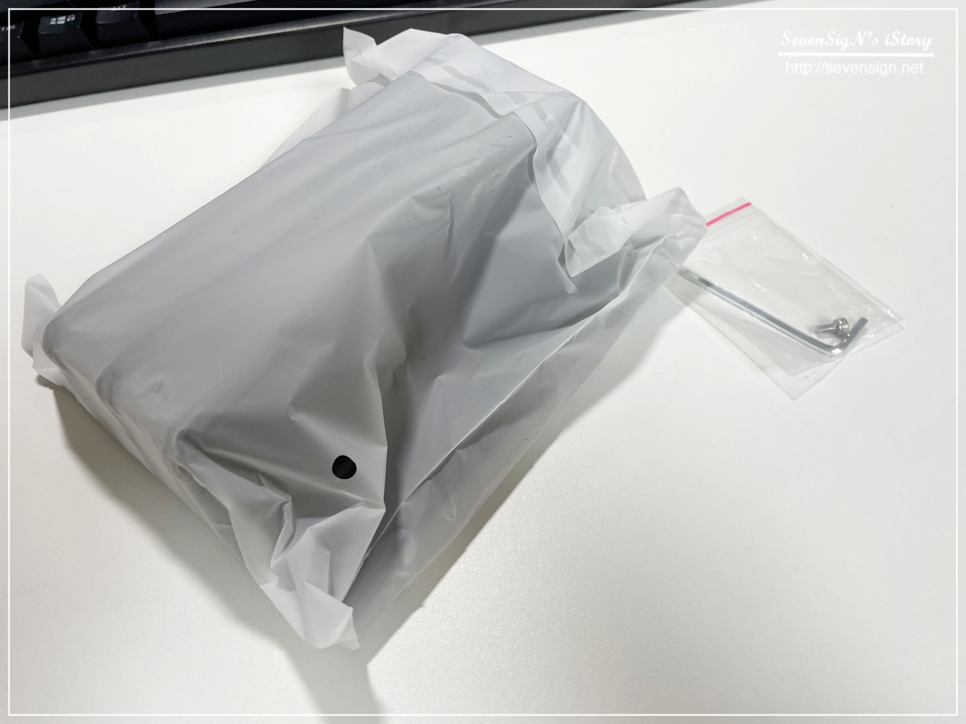 | 개봉하면 포장비닐에 보관되어 있는 스탠드 본체와 육각렌치 그리고 여분의 나사를 확인할 수 있습니다.