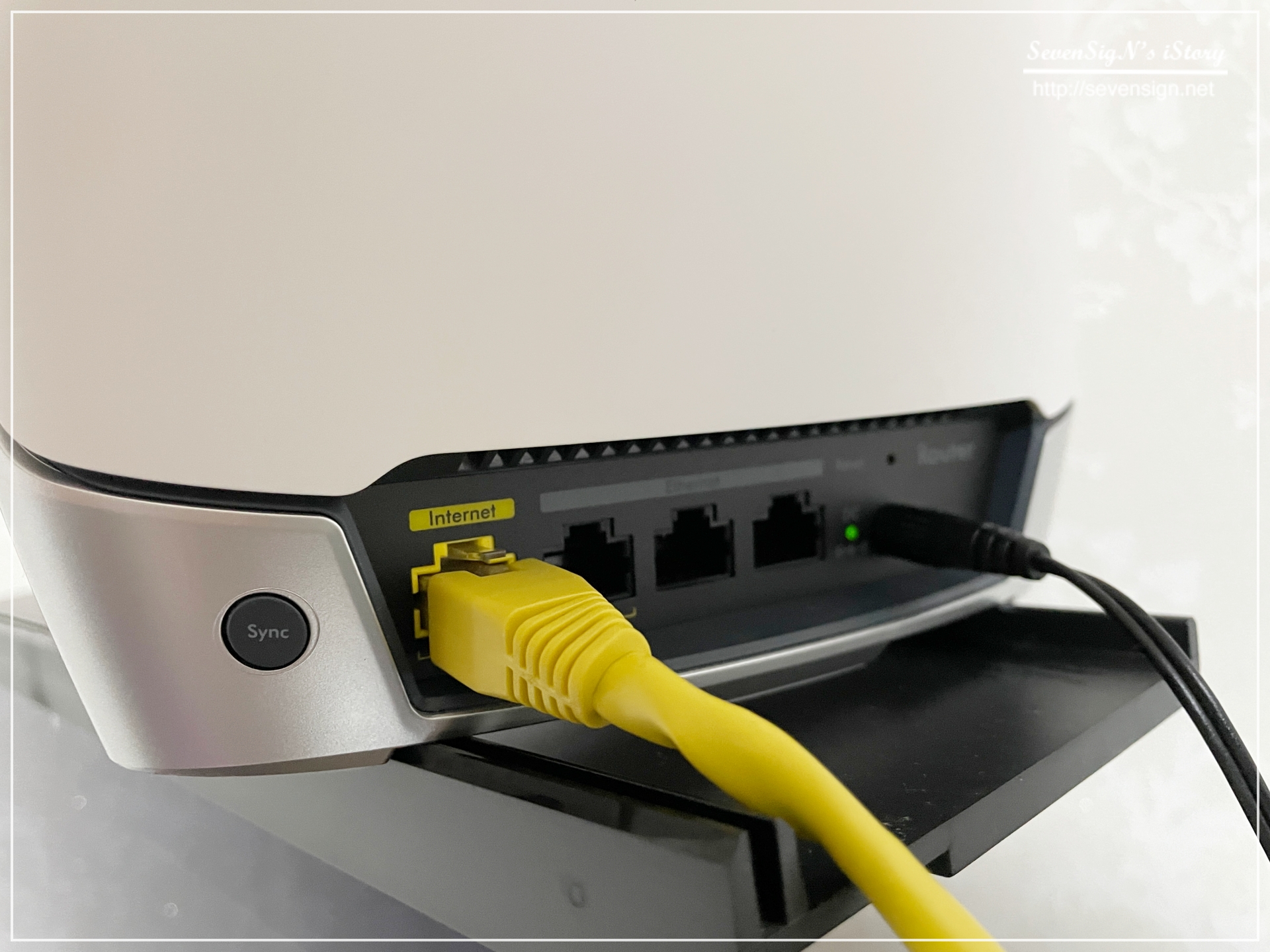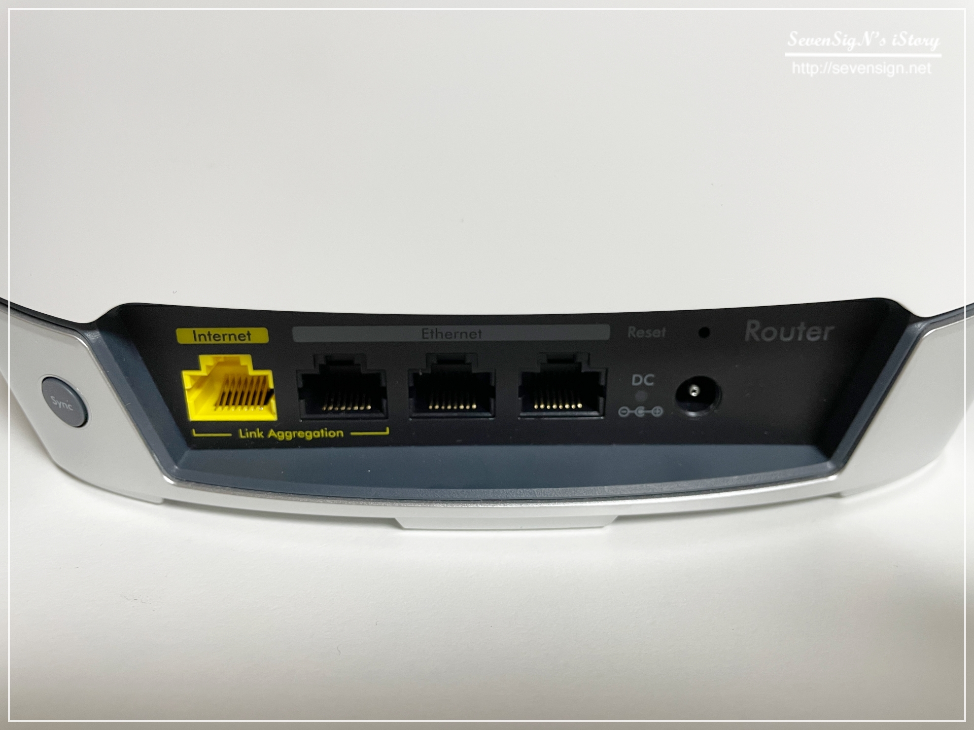 | 라우터의 구성을 보면 왼쪽부터 기가비트 인터넷 WAN포트 , LAN포트 3개, 전원단자, 리셋버튼으로 되어 있습니다. 아, 인터넷포트 왼쪽에는 Sync 버튼이 있어서 새틀라이트와 연결시 보다 쉽게 적용할 수 있습니다.