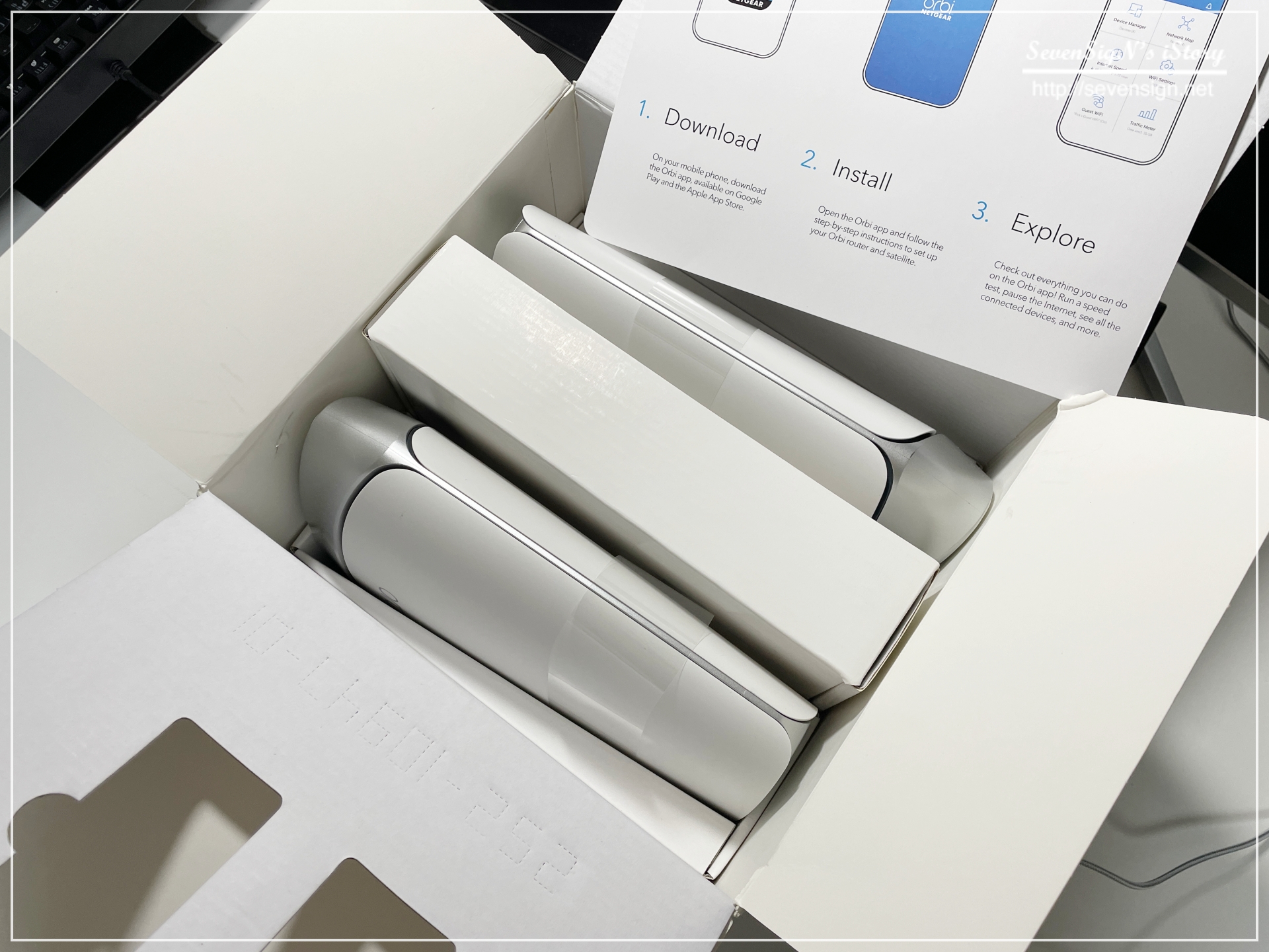 | 박스의 첫인상은 오르비 시리즈의 고유 컬러인 블루와 화이트가 깔끔한 조화를 이루고 있는 듯한 모습이었습니다. 라우터와 새틀라이트 1대가 포함되어 있는 구성입니다.