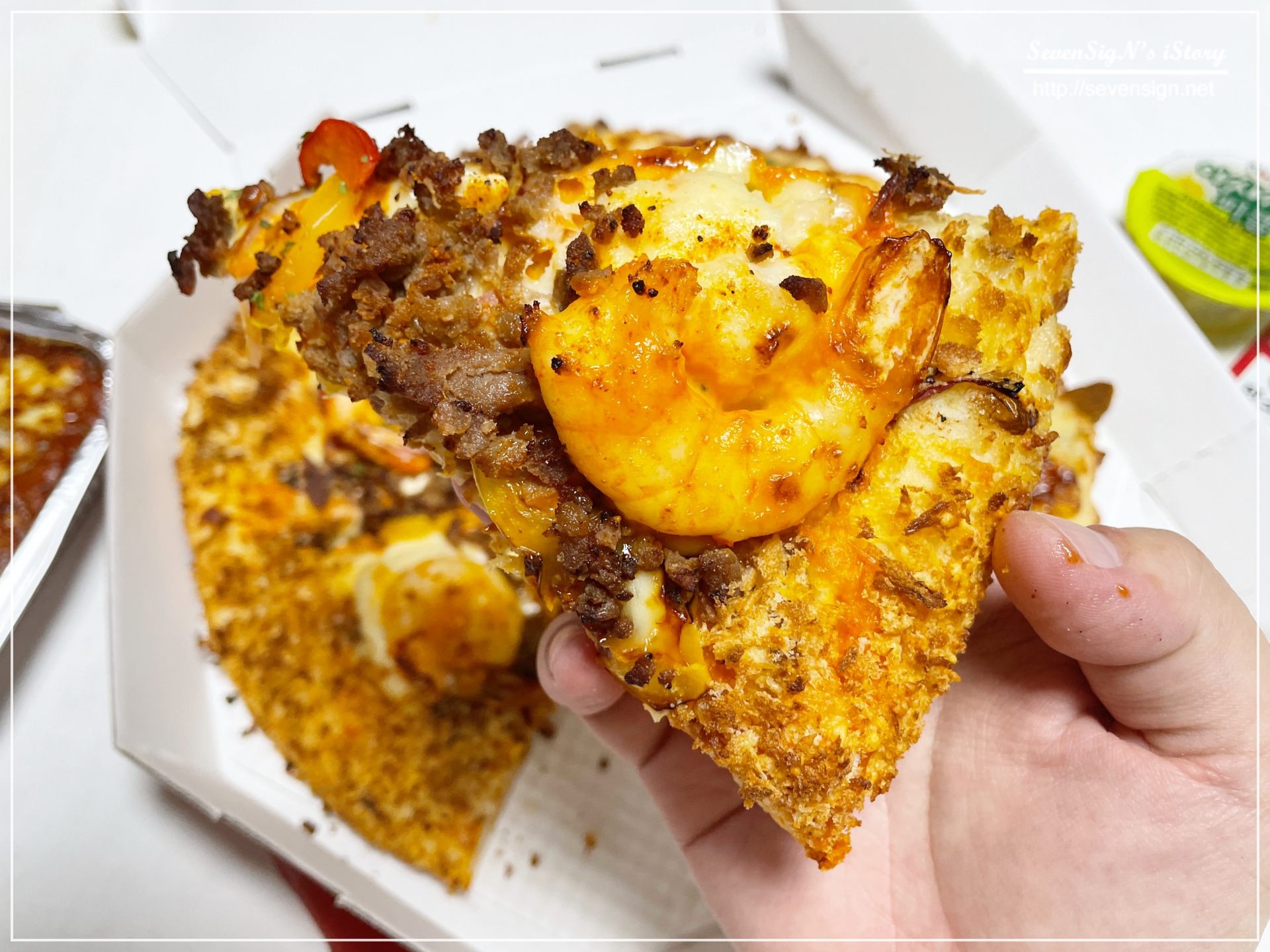 반은 쉬림프, 반은 비프 토핑이 골고룰 뿌려져 있네요. ㅎ