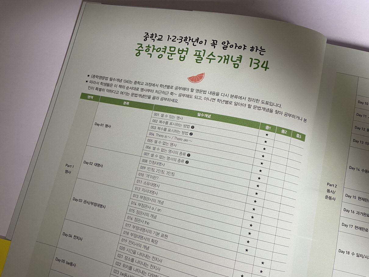 중학영문법 총정리에서는 중학교 1,2,3학년이 알아야할 필수 개념 134개를 다루고 있는데,