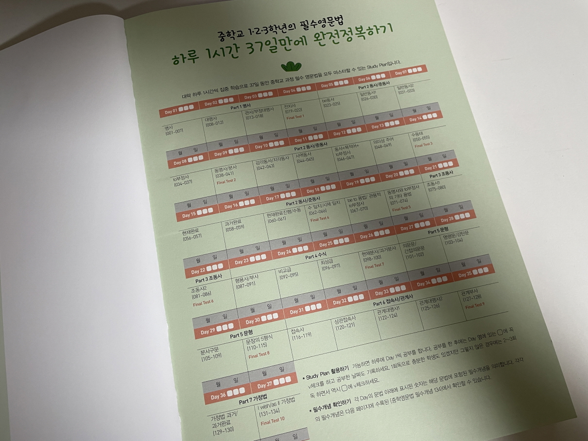 중학영문법 총정리는 하루 1시간씩 37일 완성으로 학습할 수 있도록