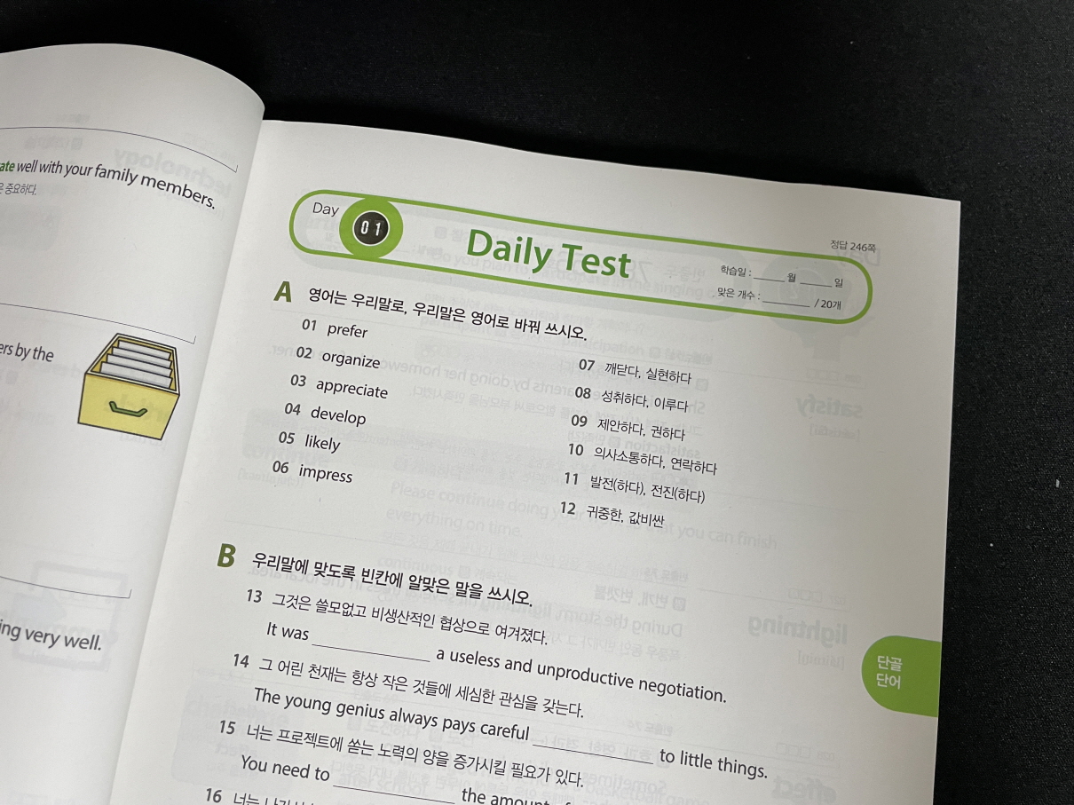 공부 순서는 하루 하루 영단어를 익히고 테스트를 하며 마무리 하게 되는데요,