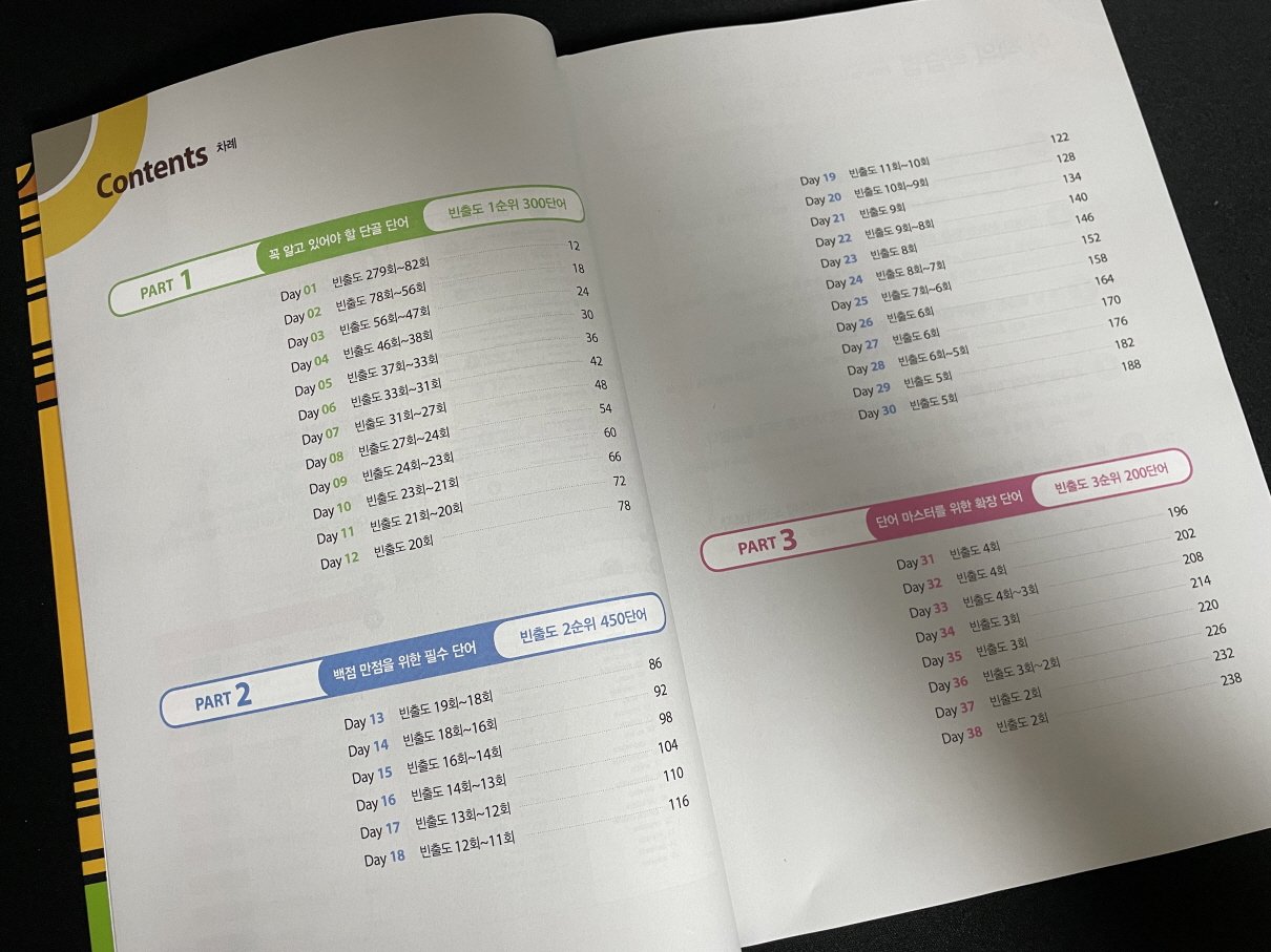 영단어는 빈출 순서대로 품사와 예문, 관련 숙어 등을 통해서